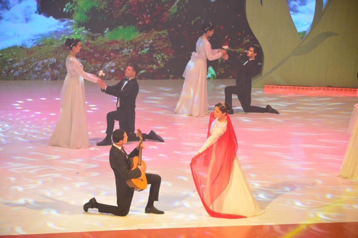 The stage featured songs based on poems by Turkmen poets - «Ýazgül», «Gel ýanyma», «Ýeke goýma», «Diňle», «Goýberme meni» and others. The special tender tone of the numbers was highlighted by the performances of the State Dance Ensemble of Turkmenistan, the folklore group «Serpaý» and the choreographic groups «Näzli», «Galkynyş», «Aşgabat», «Meňli», «Altyn miras», «Laçyn». Through the language of dance, the artists conveyed their overwhelming feelings of love and gratitude for the woman. All performances were accompanied by videos.