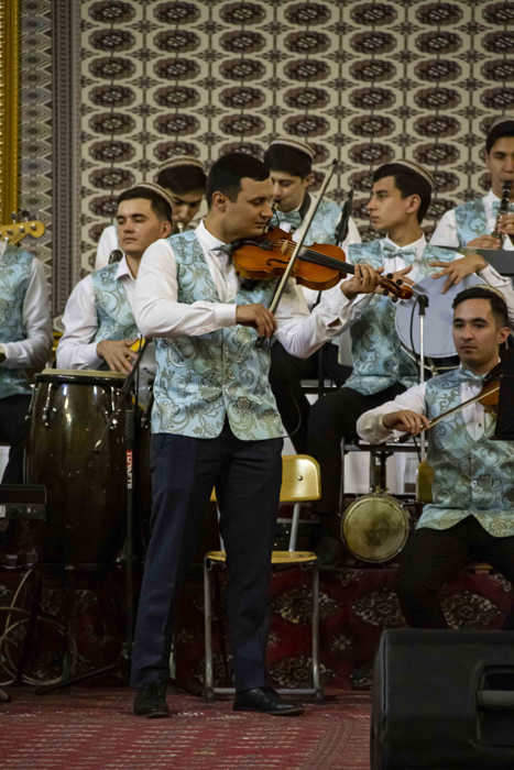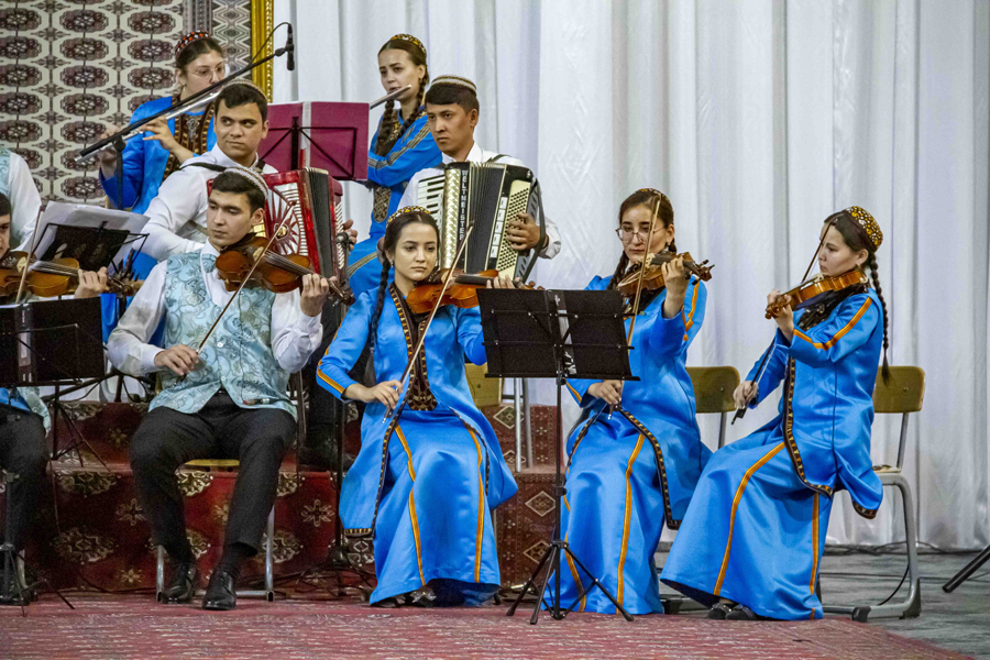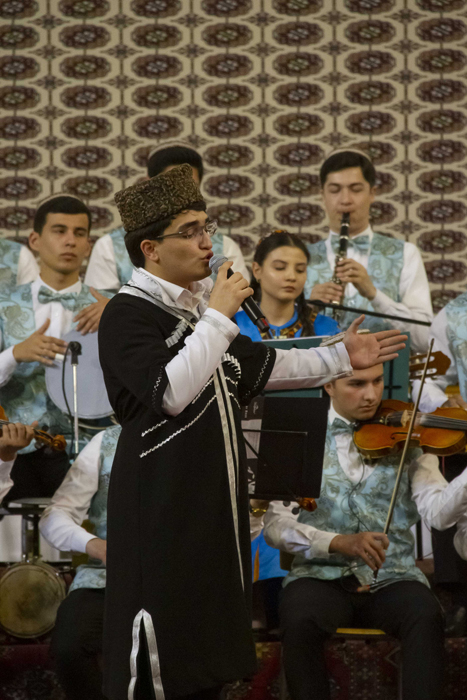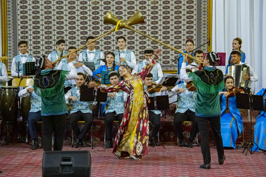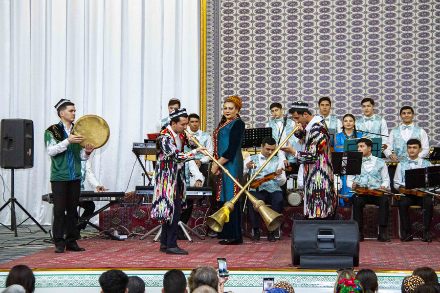 The performance of Halmyrat Begenjov and Atamyrat Baratov with the song «Musical Teahouse» was spectacular. The first to appear on stage were musicians with Uzbek folk instruments karnay. The charismatic look and sound of the carnaya, the favourite melody of the song from the repertoire of Faruh Zakirov and the performing skills of the variety students left an unforgettable impression.