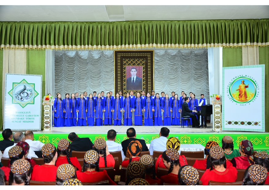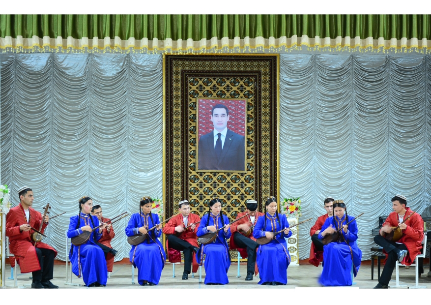 The audience was captivated by the "Köneürgenç" school choir's performance of V. Akhmedov's work to the words of the great classic of Turkmen literature Magtymguly Fragi "Türkmeniň", the virtuoso xylophone performance by 2nd year student Sh. Batyrov "Rondo" by the Italian violinist, composer and music teacher Antonio Bazzini, and the miniature "Troika" from the orchestral suite "The Snowstorm" by Georgy Sviridov played by the "Ovaz" chamber orchestra under the direction of O. Bayliev. The 2nd year student D. Ismailov performed the Turkmen folk music "Bibi" virtuosically on the gijak, the "Bagtyýar ýaşlar" dance group of the school demonstrated the lively dance "Çopanlar tansy", and the work "Parahatçylyr we Watan marşy" by O. Gurbanyazov was performed inspirationally and solemnly by the ensemble of wind and percussion instruments, and other compositions.