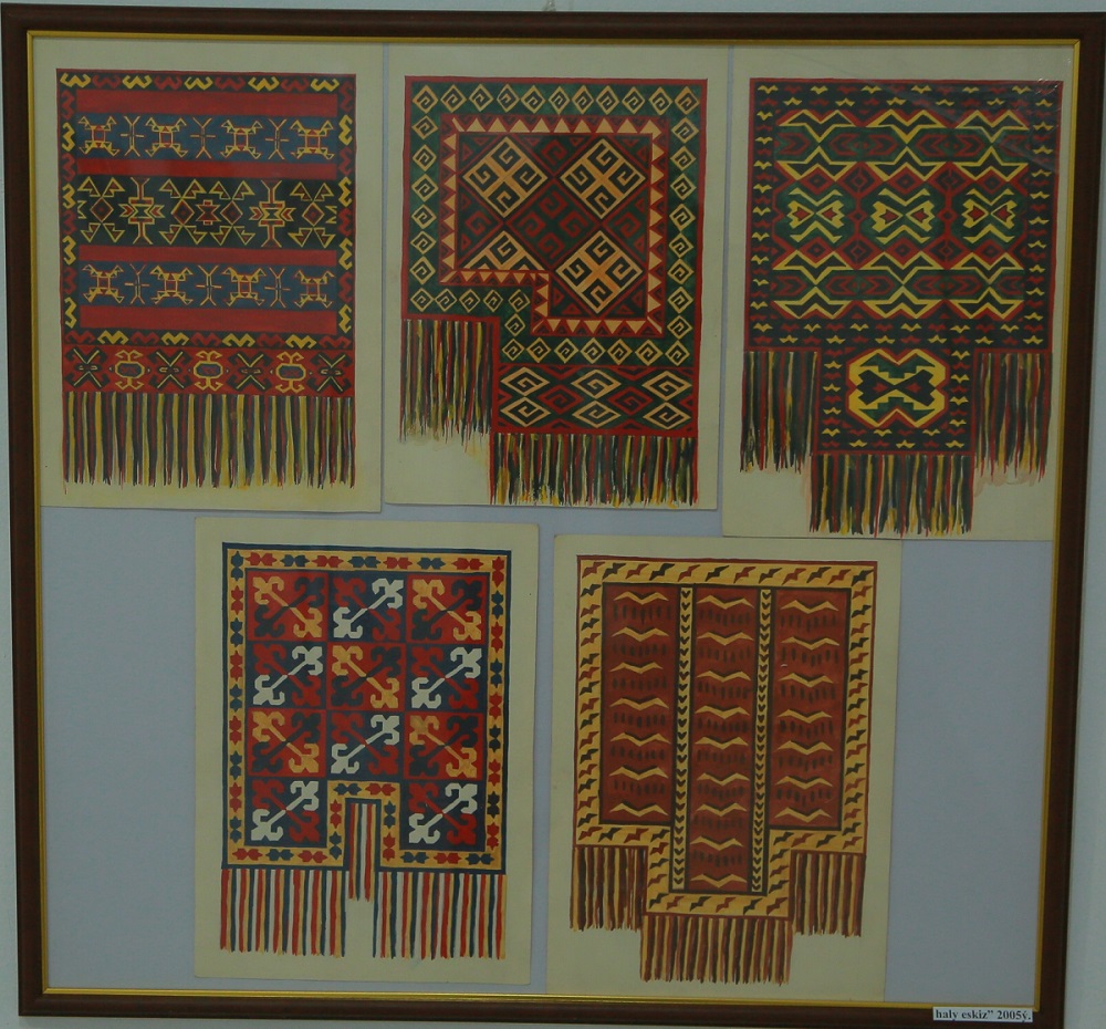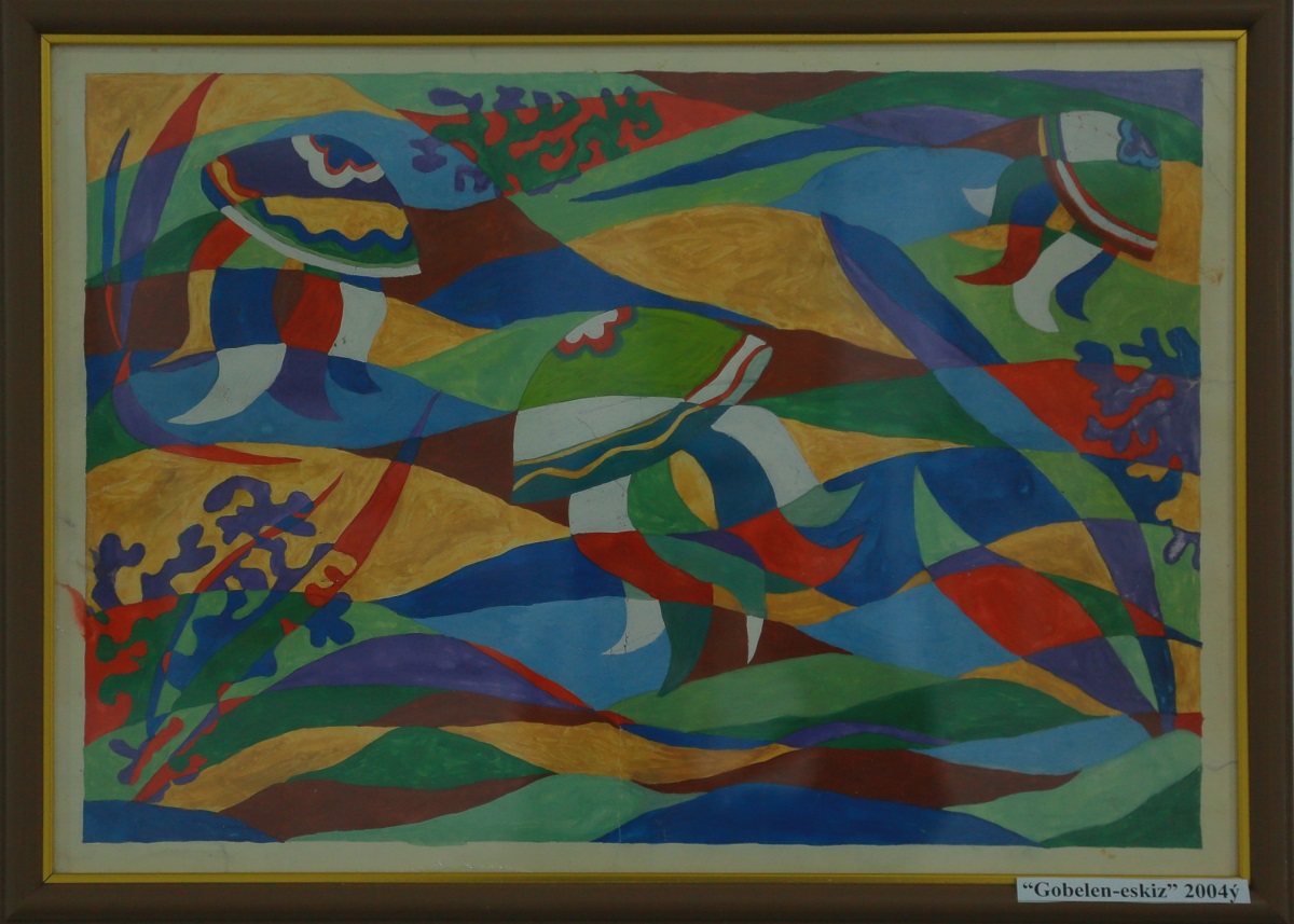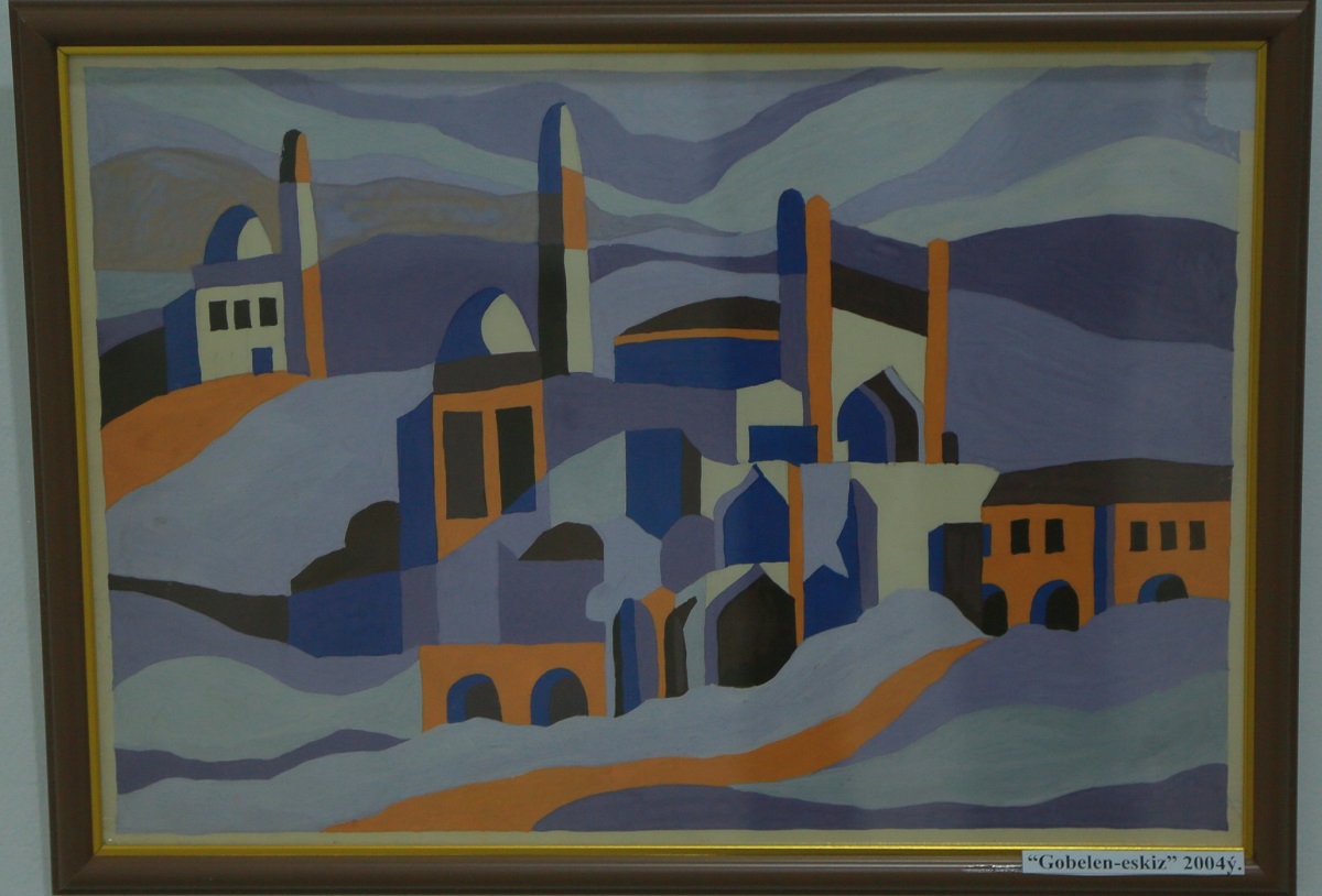 Из ковровых изделий особое внимание зрителей привлек ковер с изображением в центре стилизованного сооружения, похожего на мечеть, а также на кеджебе – свадебную повозку или же на ювелирное украшение. Каждому зрителю дано право по своему выбору определить предназначение этого сооружения.