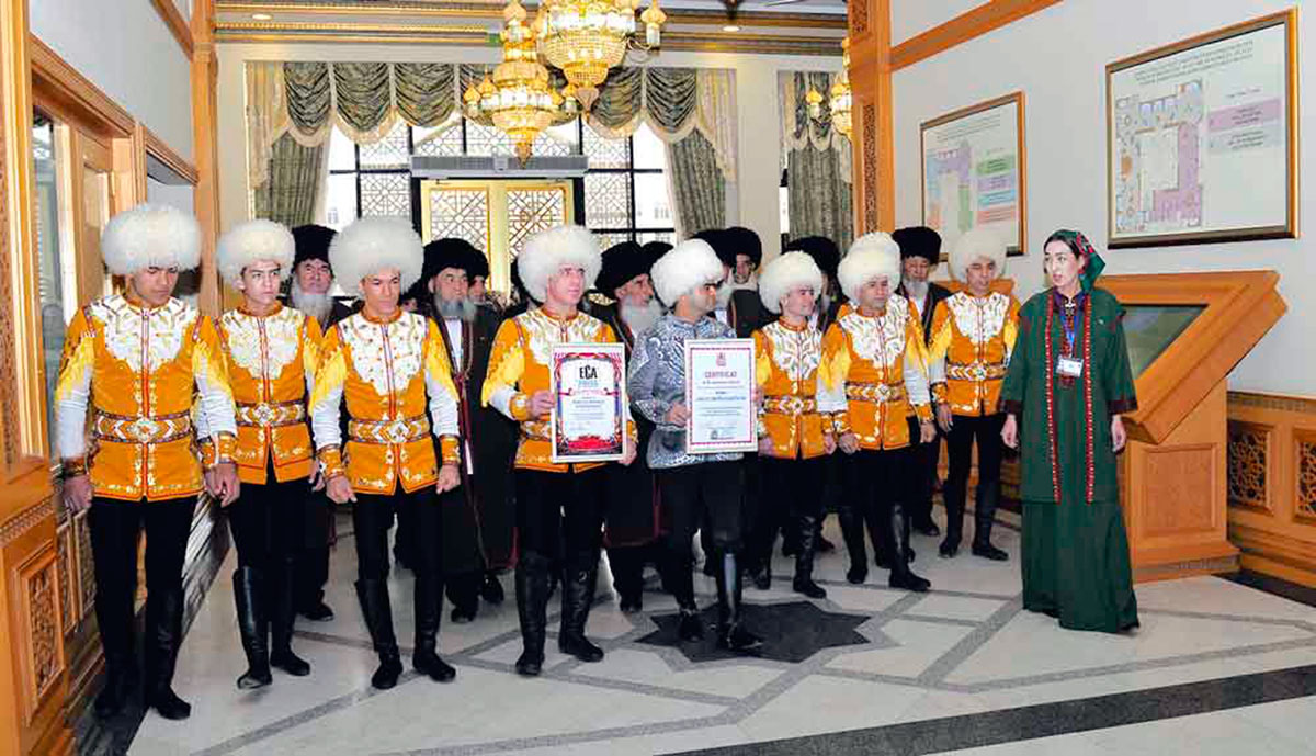 Далее гости проследовали к зданию «Türkmeniň ak öýi». Здесь членов Группы встретили вдохновенными песнями и музыкой. Перед гостями развернулось театрализованное музыкально-песенное представление, воспевающее «небесных» скакунов – бесценное наследие наших предков.