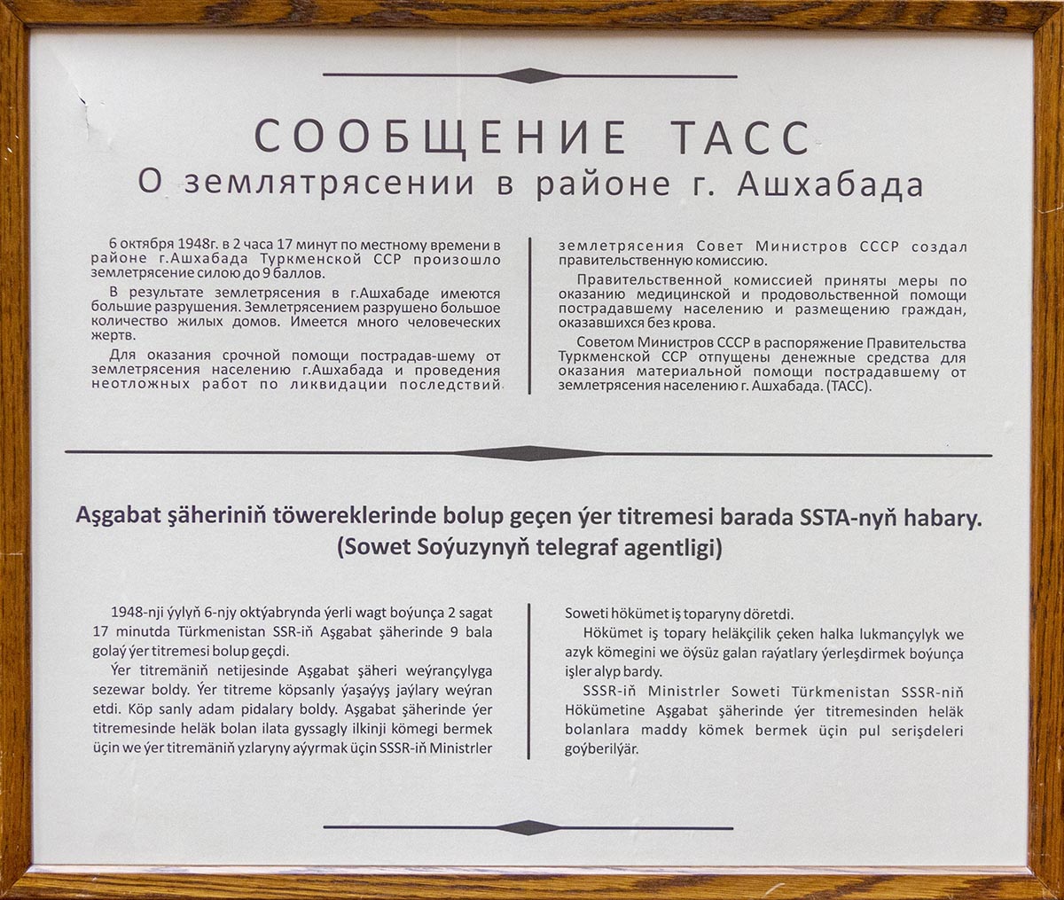 В Государственном музее Государственного культурного центра Туркменистана развернута выставка «Священная память». Экспозиция начиналась с выставленного в виде экспоната сообщения ТАСС о землетрясении: