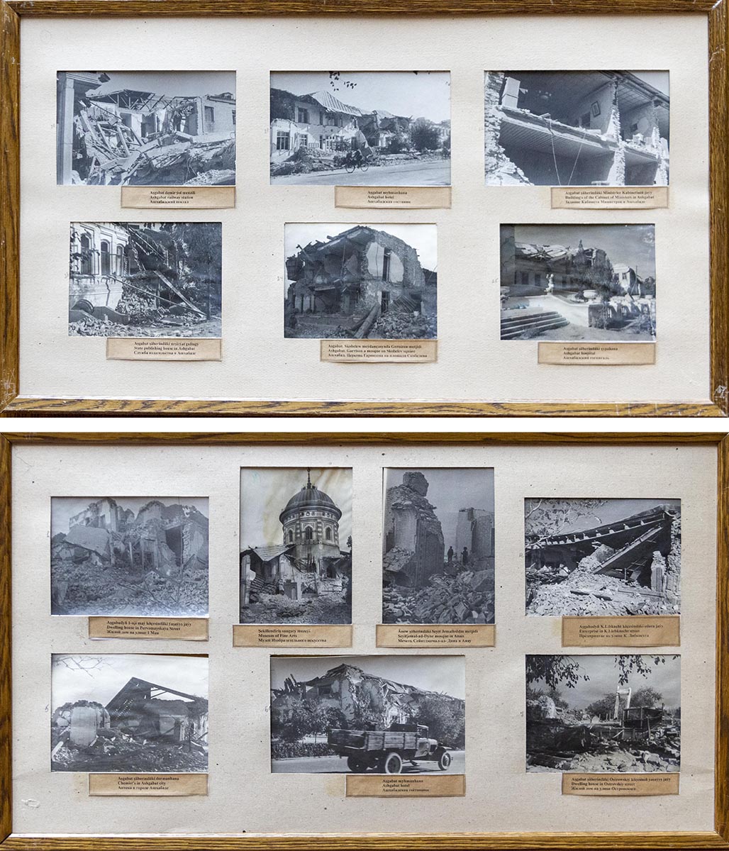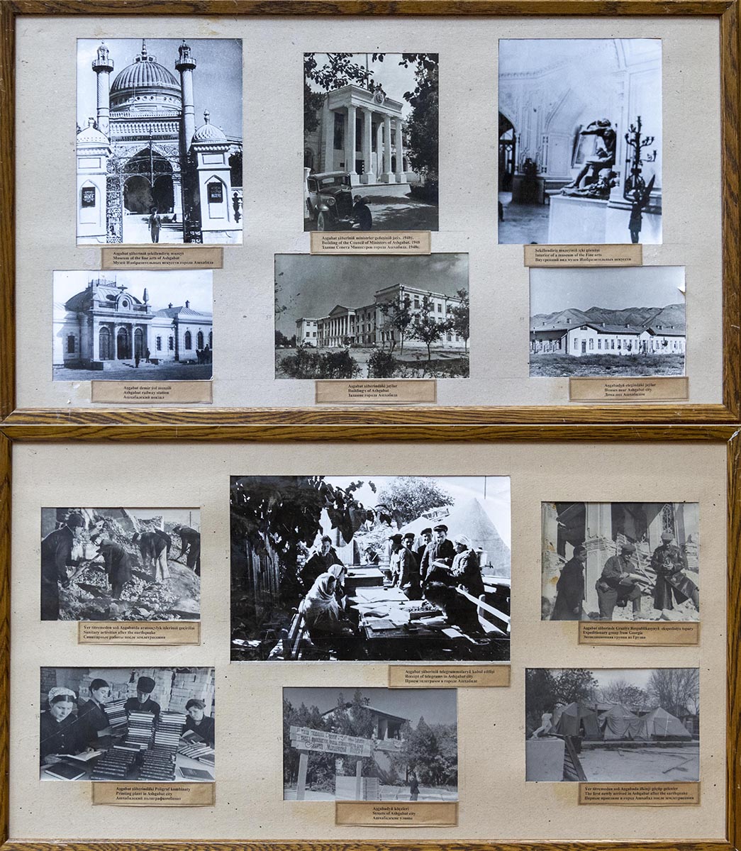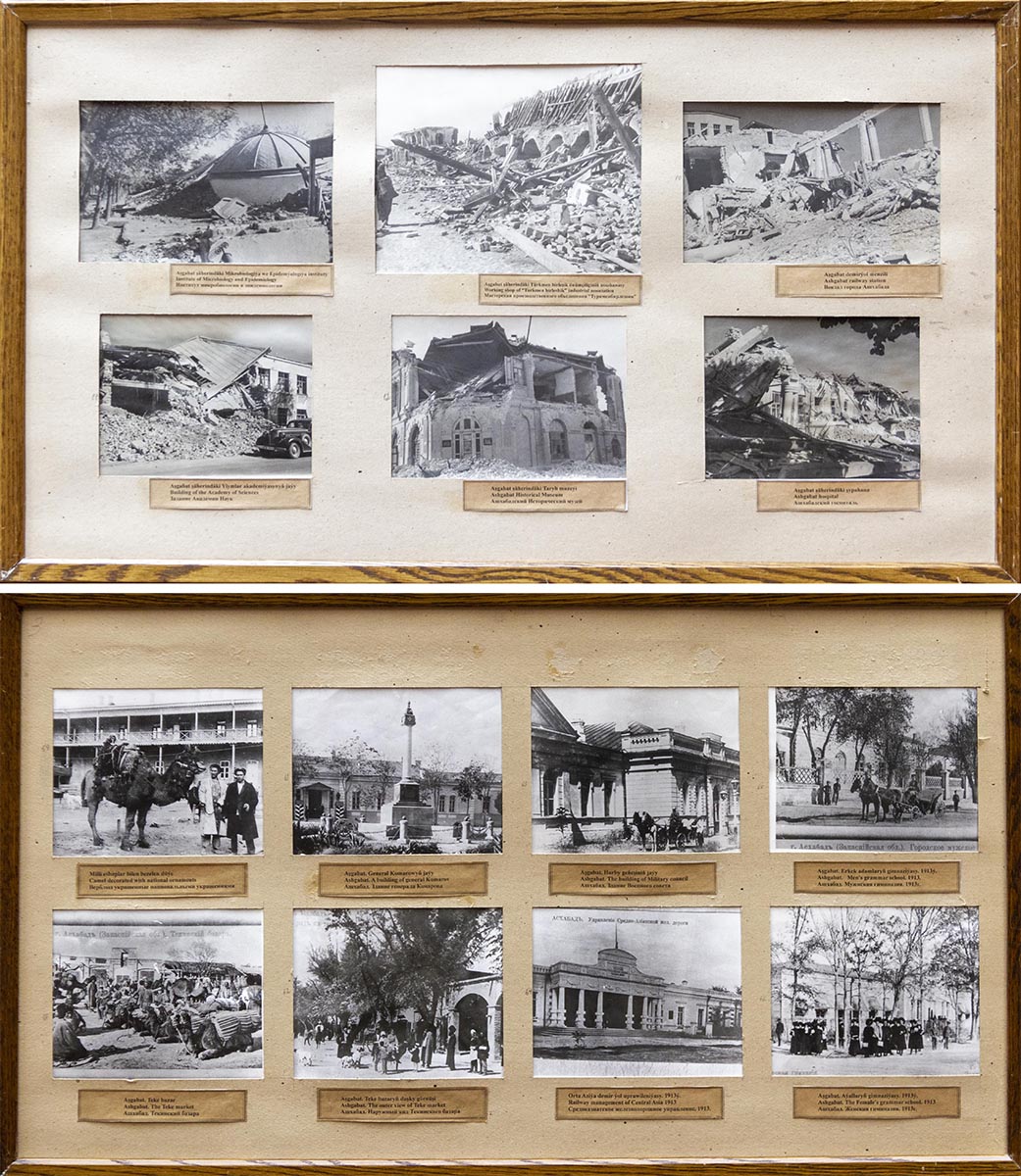 Экспозиция в музее представлена по нескольким разделам. Ценные фотоматериалы из хранилищ музея раскрывают перед посетителями интересную информацию о том, каким был Ашхабад до революции, тогда он назывался Асхабад. На фотодокументах, датируемых 1913 годом, можно увидеть здание каравансарая, мужской гимназии, Мечеть религиозного течения бахаизм. А затем – уютный Ашхабад до землетрясения, в центре города с двухэтажными зданиями из жженного кирпича. Другой раздел – во что превратился радостный солнечный город в результате землетрясения…