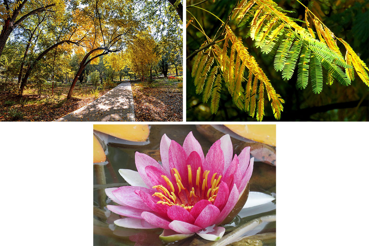 Многие теплолюбивые растения переселились на зиму в теплицы, а вот декоративные бананы японские останутся на прежних местах, им достаточно утеплить корни, чтобы благополучно перезимовать. Шесть важных темно-зеленых и голубых кипарисов торжественно окружают центральный бассейн ботанического сада, а там в грустном одиночестве плавает розовая кувшинка: «подружки» уже отцвели и ей не с кем даже обмолвиться словом. Кувшинки относятся к роду многолетних водных трав с плавающими крупными листьями и цветками.