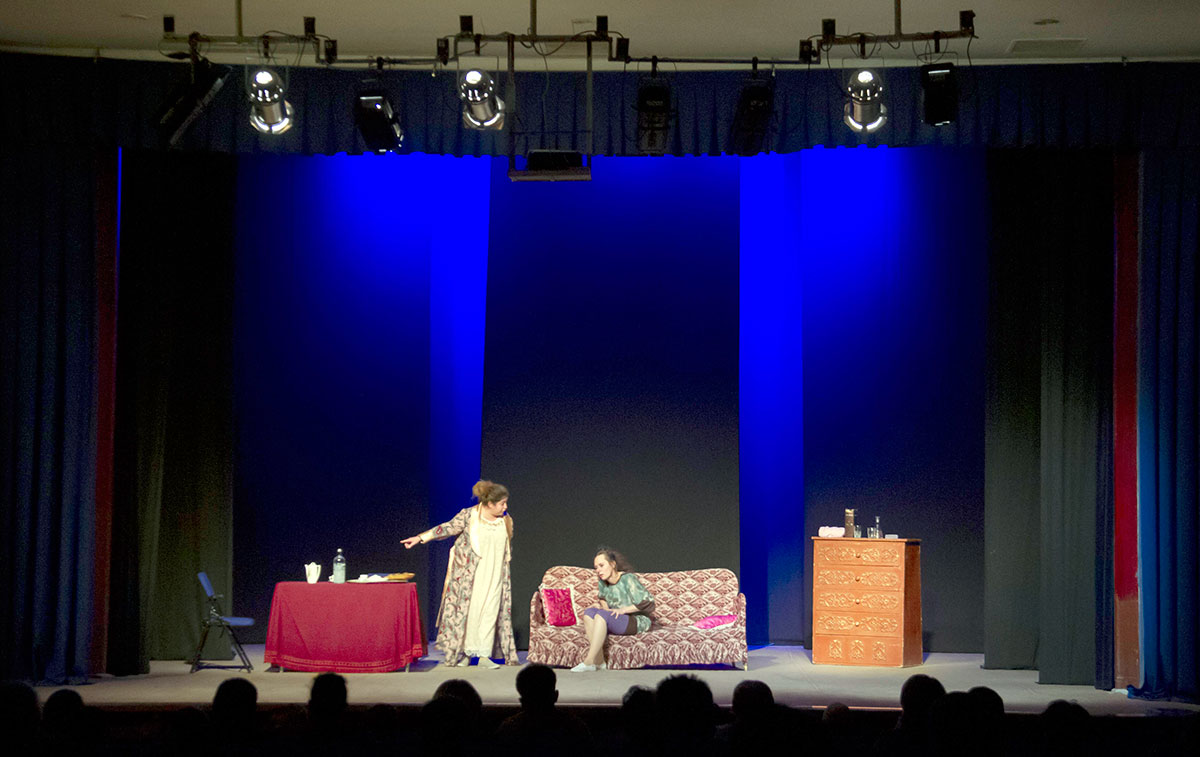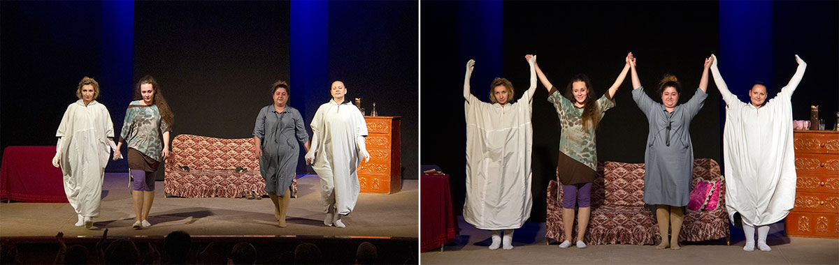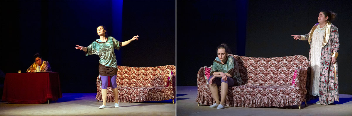 Очень украсила спектакль пантомима, которую прекрасно исполнили Анастасия Баландина и Любовь Емельянова в постановке хореографа Майи Пурсияновой. Обе танцовщицы в масках, олицетворяющих обман. Их фигурки мечутся, выражая внутренние состояние сестер. Они стремятся достучаться друг до друга, но напрасно. Боль, обиды, ненависть – переживаются заново.