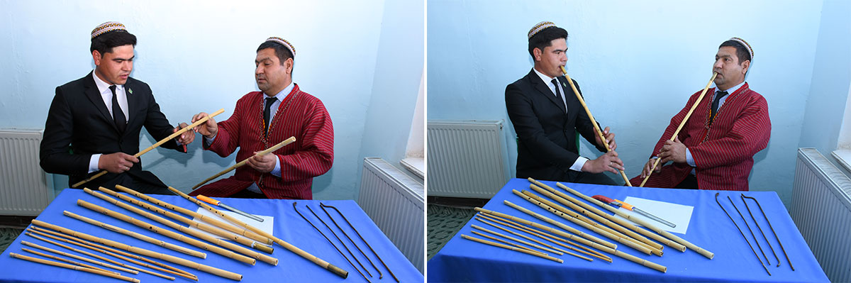 Мы встретились с Мухаммедом Сапаровым, когда он объяснял ученикам тонкости изготовления национального туйдука. Изготавливается он из камыша длиной 750 – 800 мм. Чтобы хорошо звучал, на него надевают мундштук. Количество отверстий – 5-6.