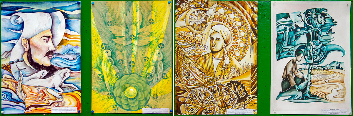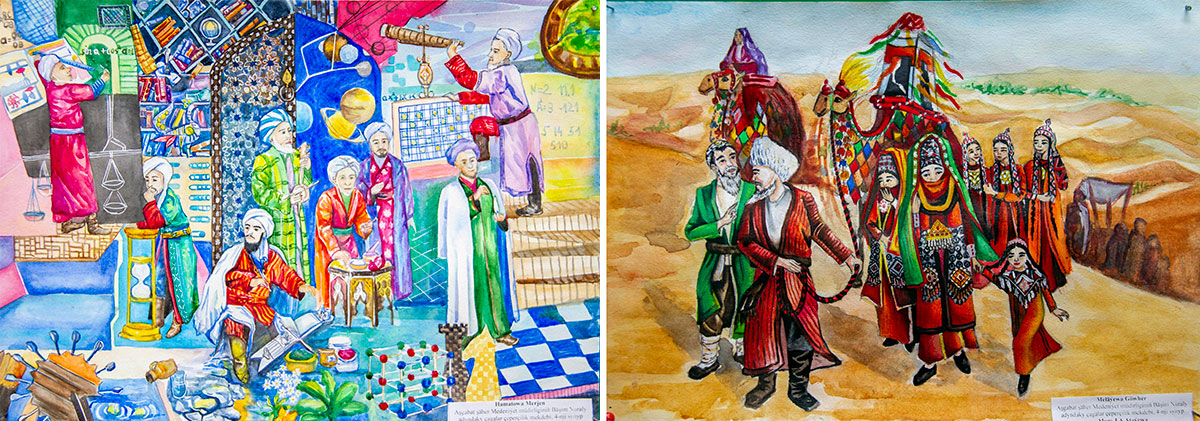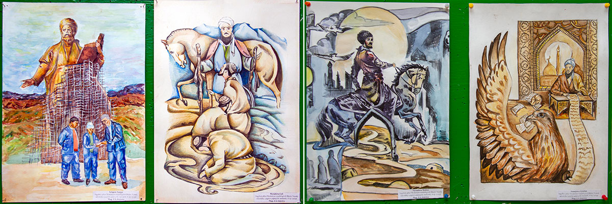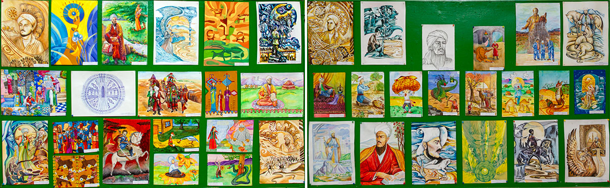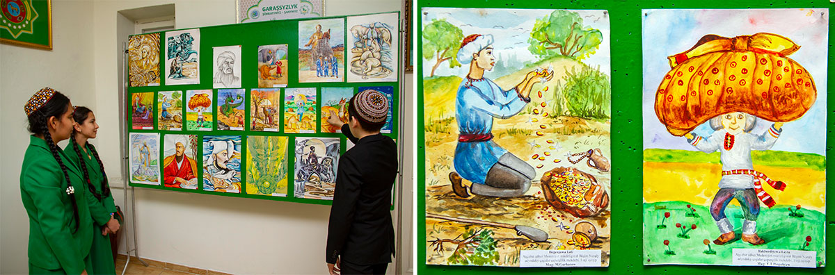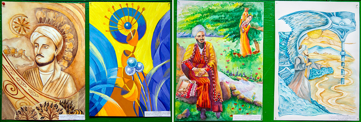 Среди первых классов самые распространенные сказочные герои Яртыгулаг, Акпамык, Дэв, Дракон, Лиса и Журавль, второклассников – Героглы, отправляющийся на своем коне в очередное путешествие, среди старшеклассников – художник, стремящийся запечатлеть время на своем холсте, притча «Что посеешь, то и пожнешь», графический портрет Махтумкули – молодого, одновременно простого и величавого.
