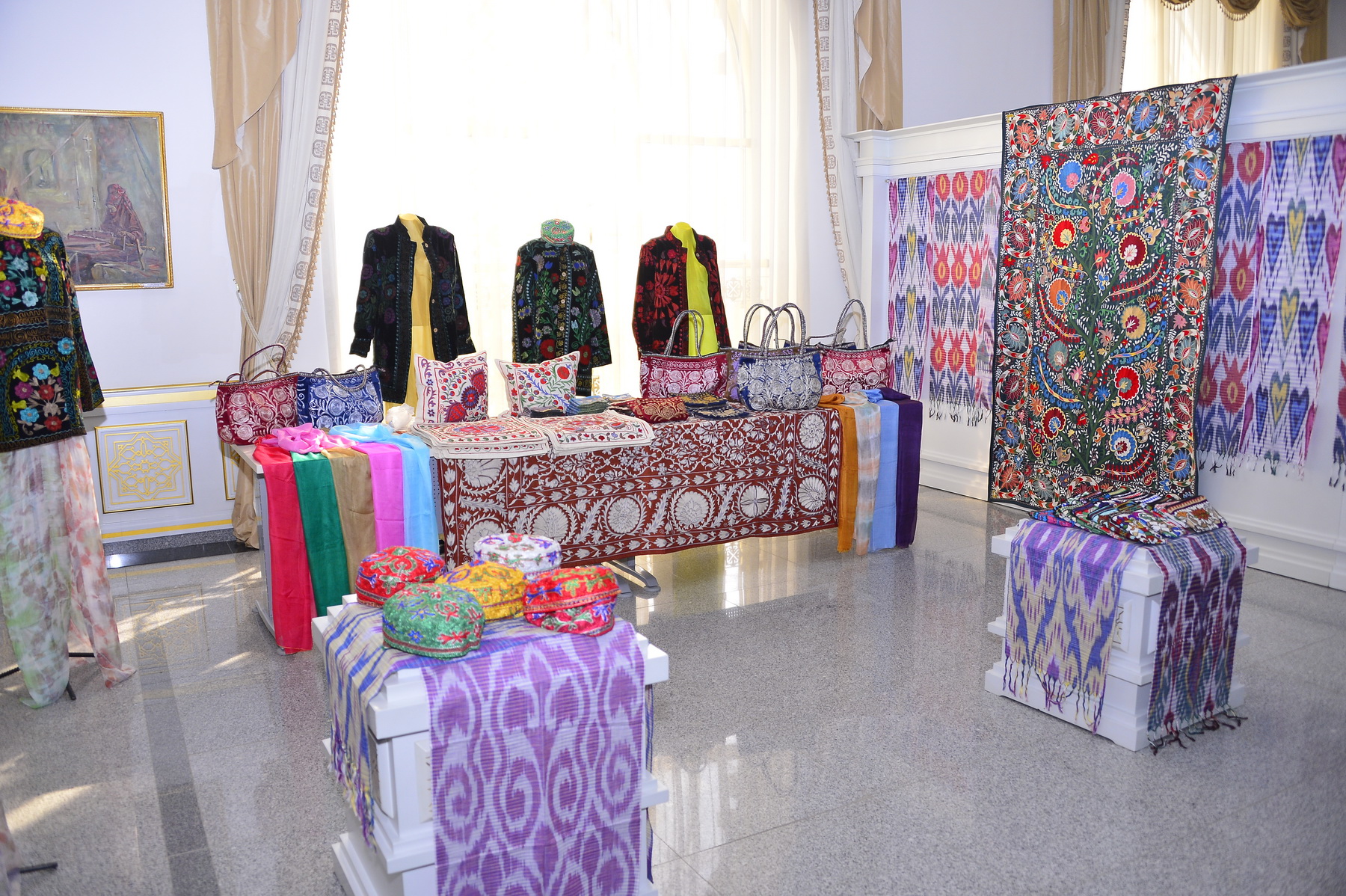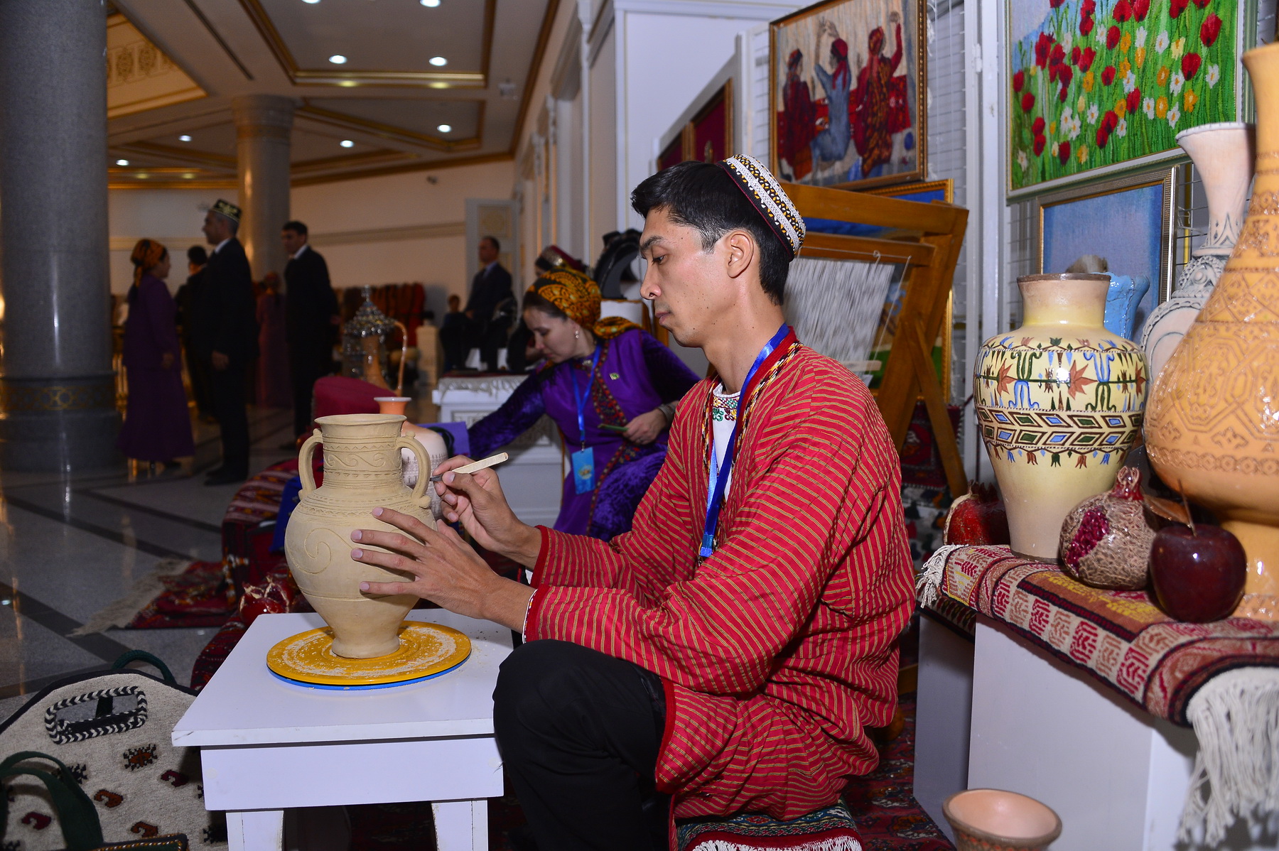 Здесь же развёрнута выставка музейных экспонатов, во всей полноте представляющая виды национального декоративно-прикладного искусства и творчества, народных ремёсел и ставшая наглядным свидетельством многогранного созидательного таланта туркмен.