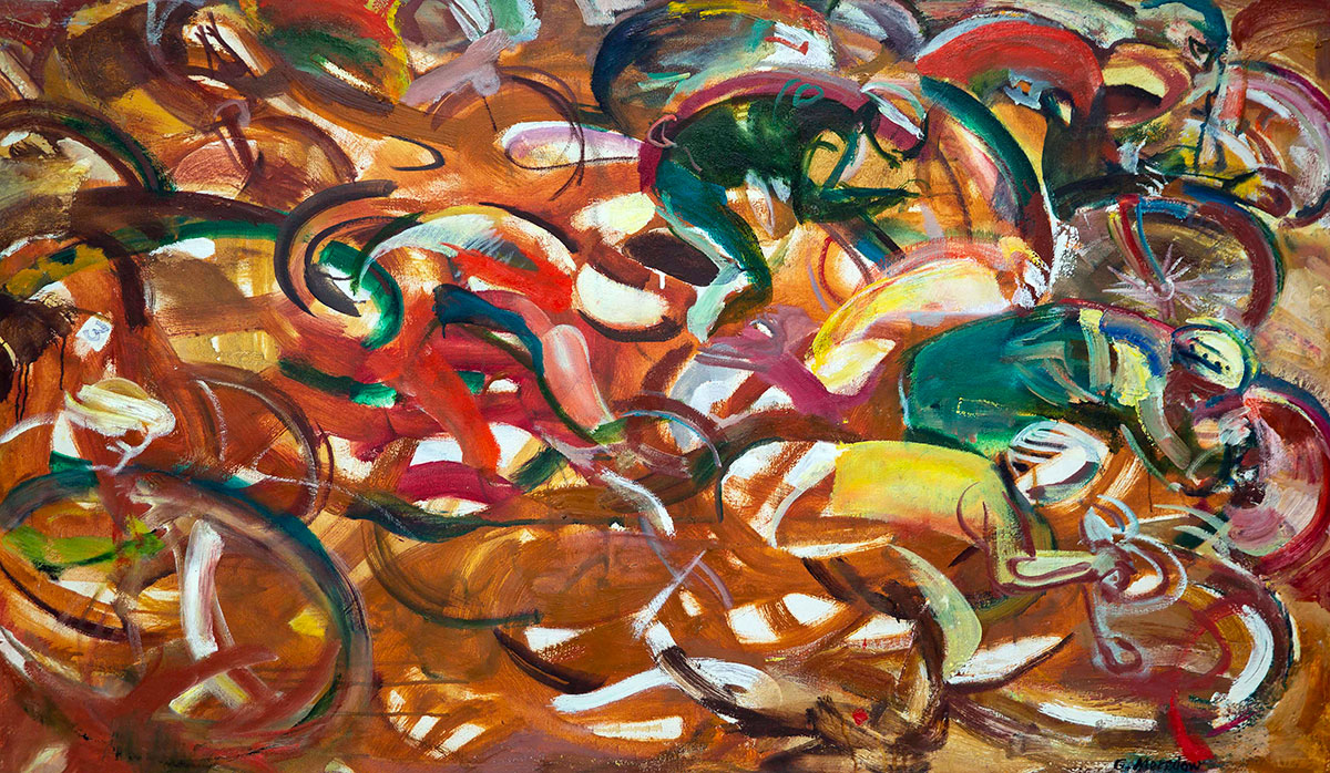В стиле абстракционизма Курбаном Мередовым представлена картина «Велостарт». Художник использовал ракурс сверху, и поэтому через фигурки велогонщиков и колеса велосипедов просвечивает коричневая поверхность велотрека, от этого картина выглядит более красочной и одновременно передает накал страстей участников состязания, взявших старт.