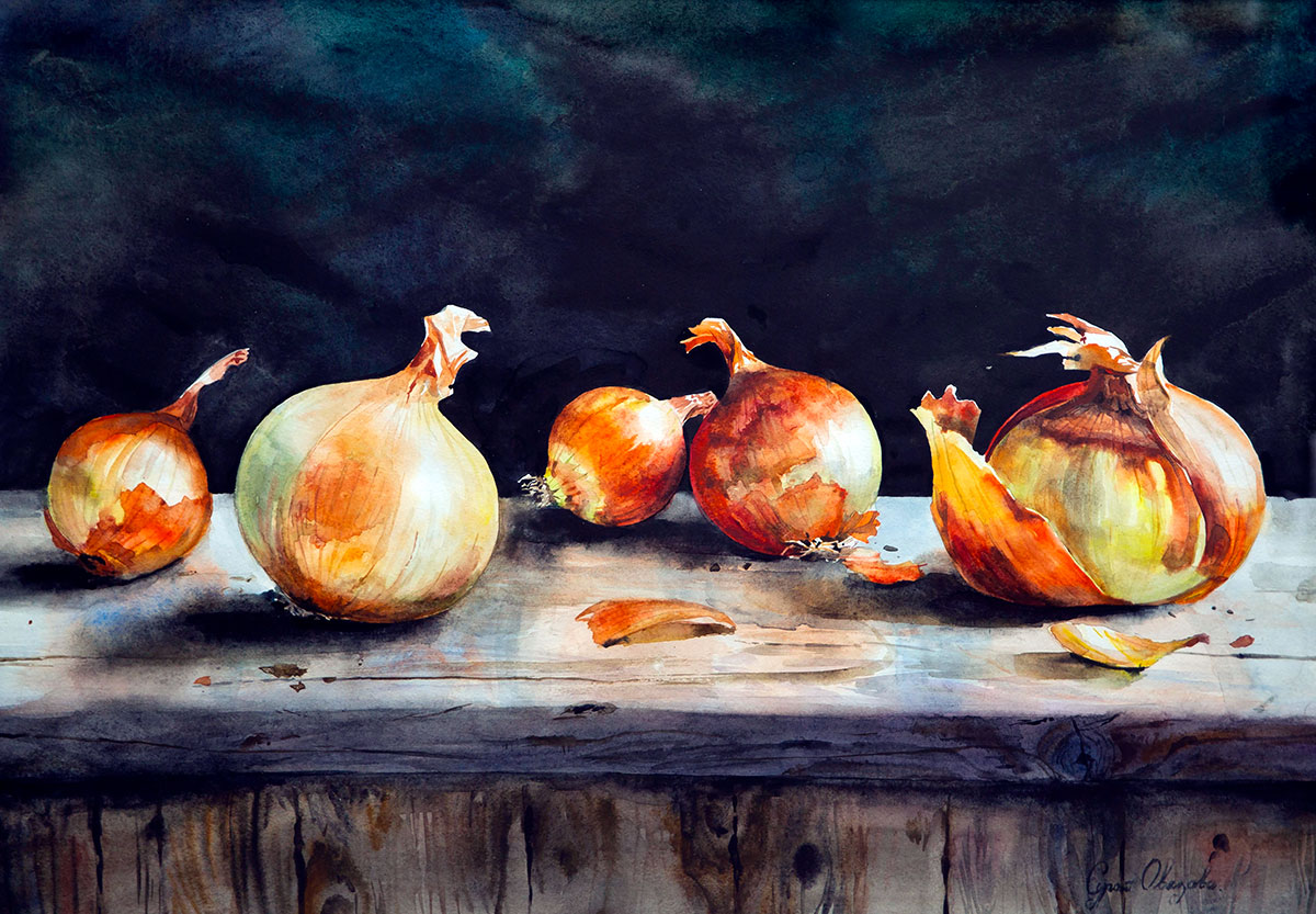Два интересных натюрморта, выполненных в стиле фламандских мастеров живописи XVI века, привлекали особое внимание зрителей. Первый – Адылша Аннамухаммедова «Натюрморт с виноградом» – передавал зрителям осязаемую плоть зрелых фруктов, на втором – Сурай Овезова изобразила несколько стоящих в ряд луковиц.