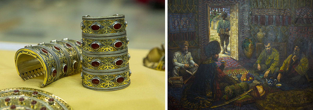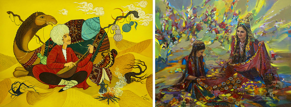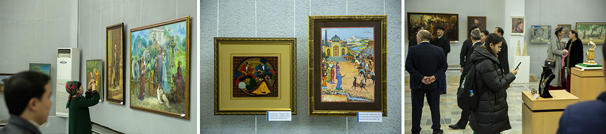 Из приставленных преподавателями работ, помимо живописных полотен, выставлены ювелирные украшения и скульптура малых форм. Большинство полотен написаны на историческую тему. Как правило, это крупногабаритные картины, выполненные в стиле реализма. К их числу относятся полотна «Алишер Навои у Султана Союн Байкары» Гунчи Мырадовой, «Блоквиль перед Говшутханом» Гурбана Бабатаджева, «Маргиана» Тойлы Чопанова. Такие работы требуют большого мастерства и знания истории своего народа. Для студентов училища – это прекрасные учебные пособия, с которых следует брать пример.