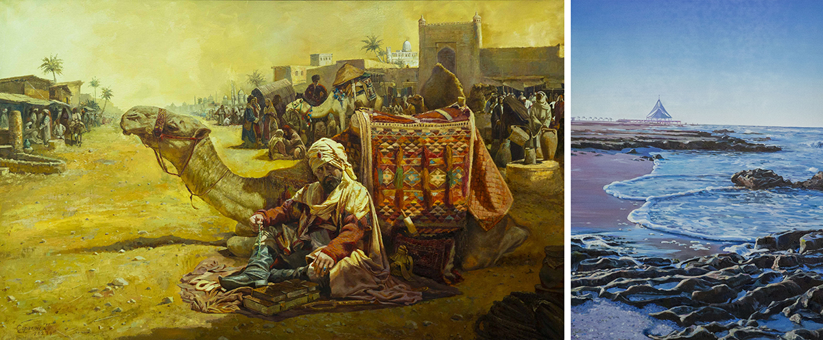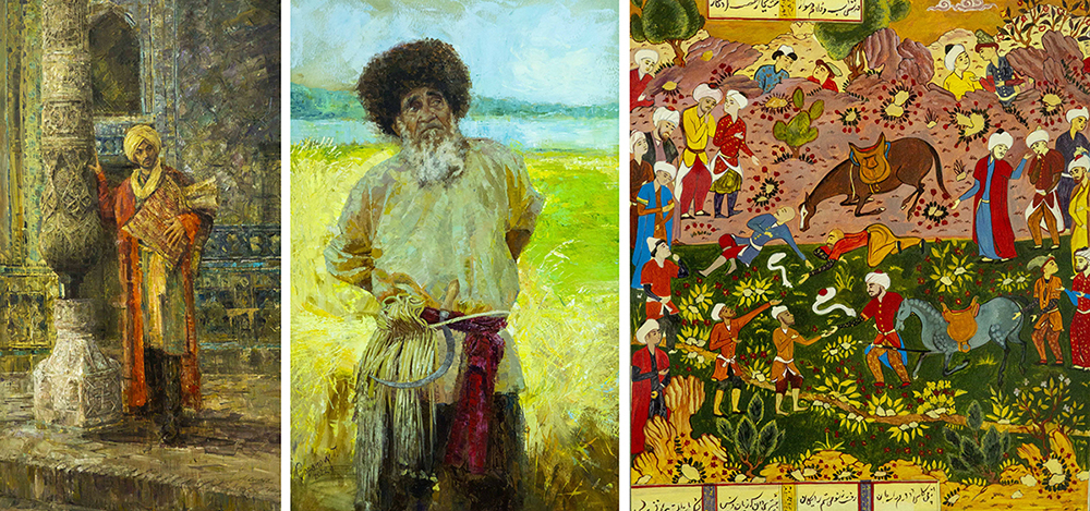 Многие преподаватели обращаются в своих работах к теме Великого шелкового пути, в которых очень ярко раскрывают характеры персонажей, обстановку базаров. Одна из таких работ – «Купец» Тойлы Чопанова. Художник представил на полотне харизматичного купца, торгующего интеллектуальным товаром – книгами.