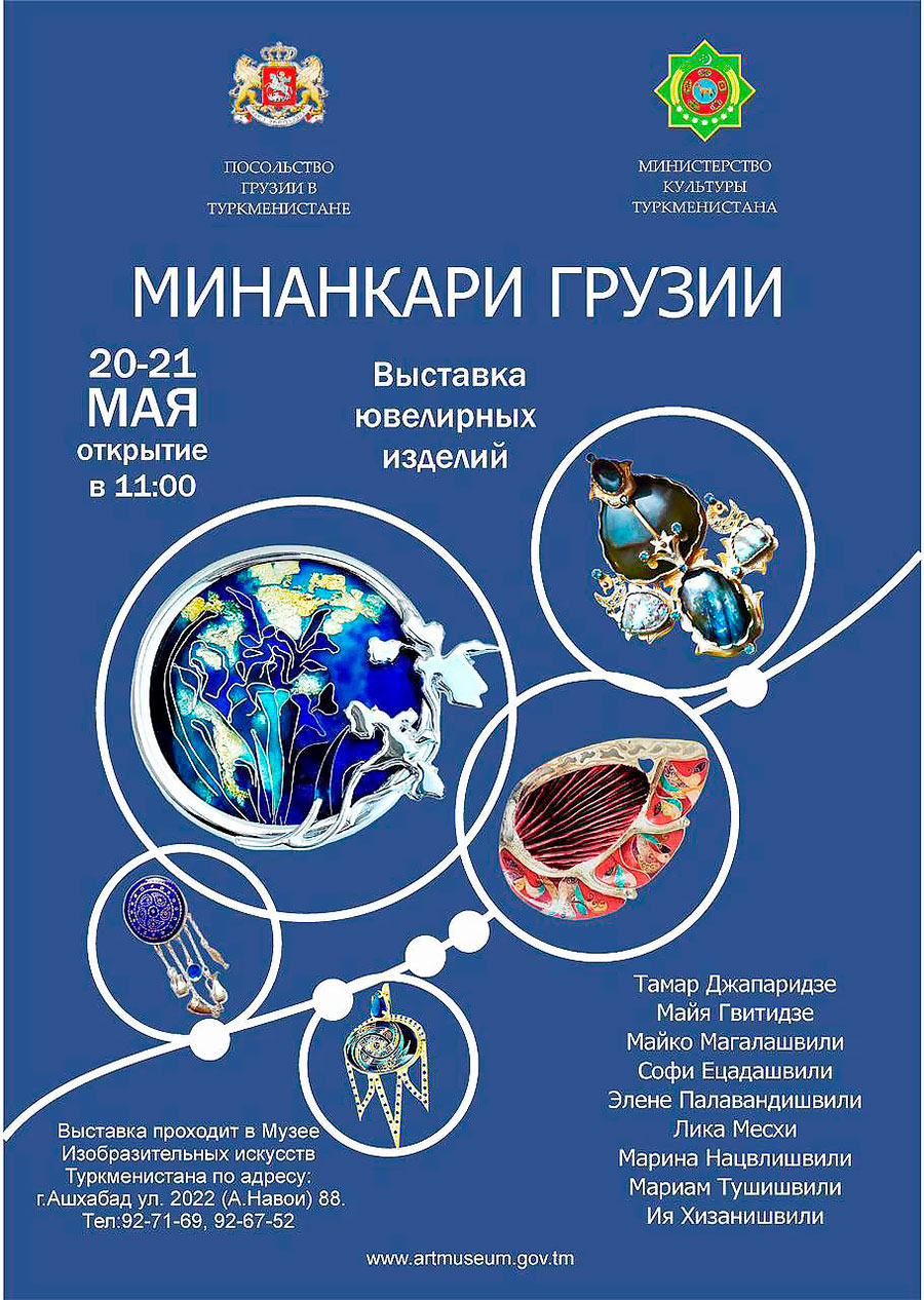 20 мая в Музее изобразительных искусств Туркменистана начнёт работу выставка ювелирных изделий. Дизайнеры и мастера, прибывшие в Ашхабад из Грузии, представят вниманию посетителей Музея разнообразные украшения, выполнение в старинной грузинской технике – минанкари.
