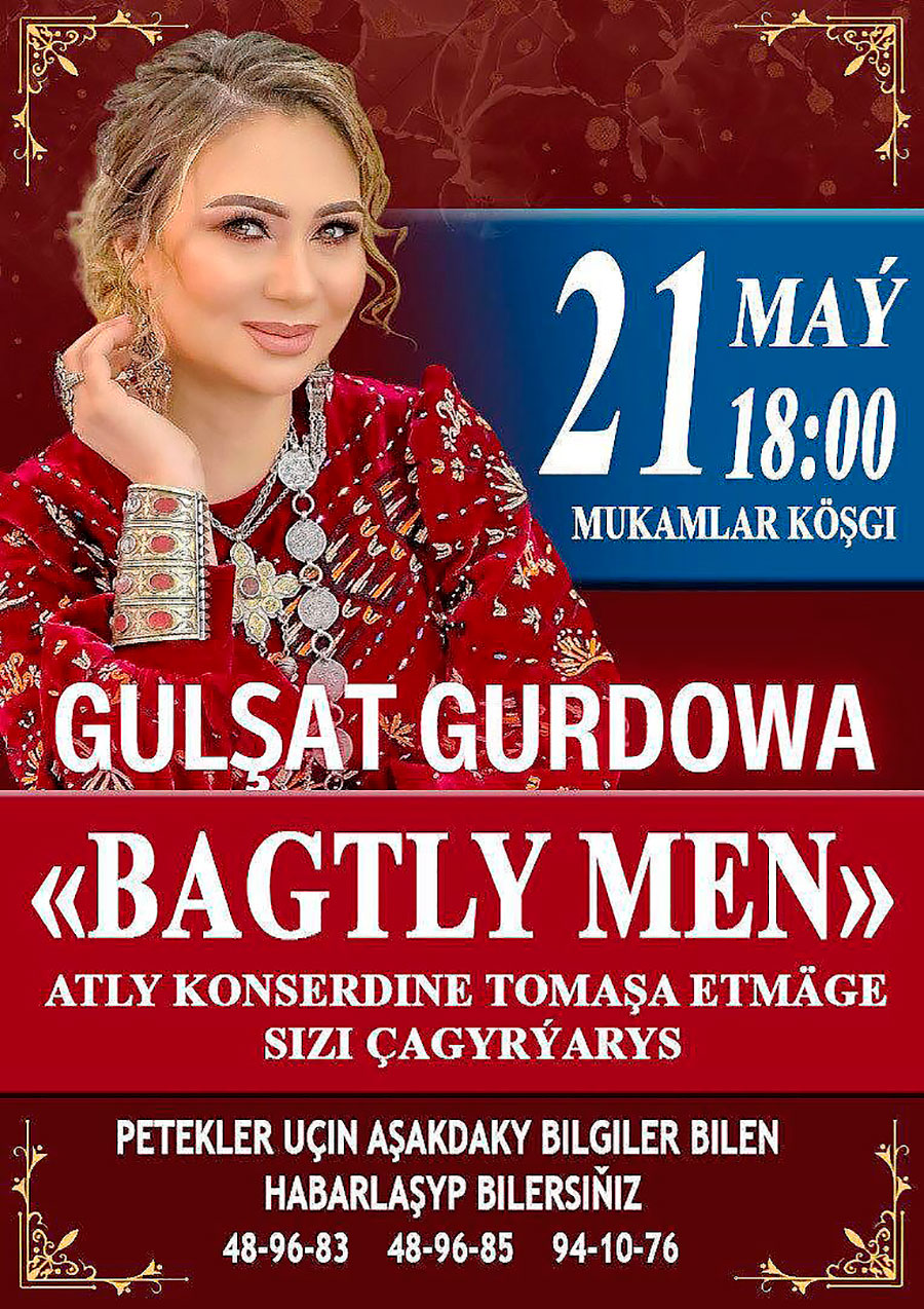 21 мая в 18:00 на сцене Дворца мукамов Государственного культурного центра состоится сольный концерт народной артистки Туркменистана Гульшат Гурдовой. В музыкальную программу под названием «Bagtly men» вошли уже известные хиты, а также новые песни исполнительницы.