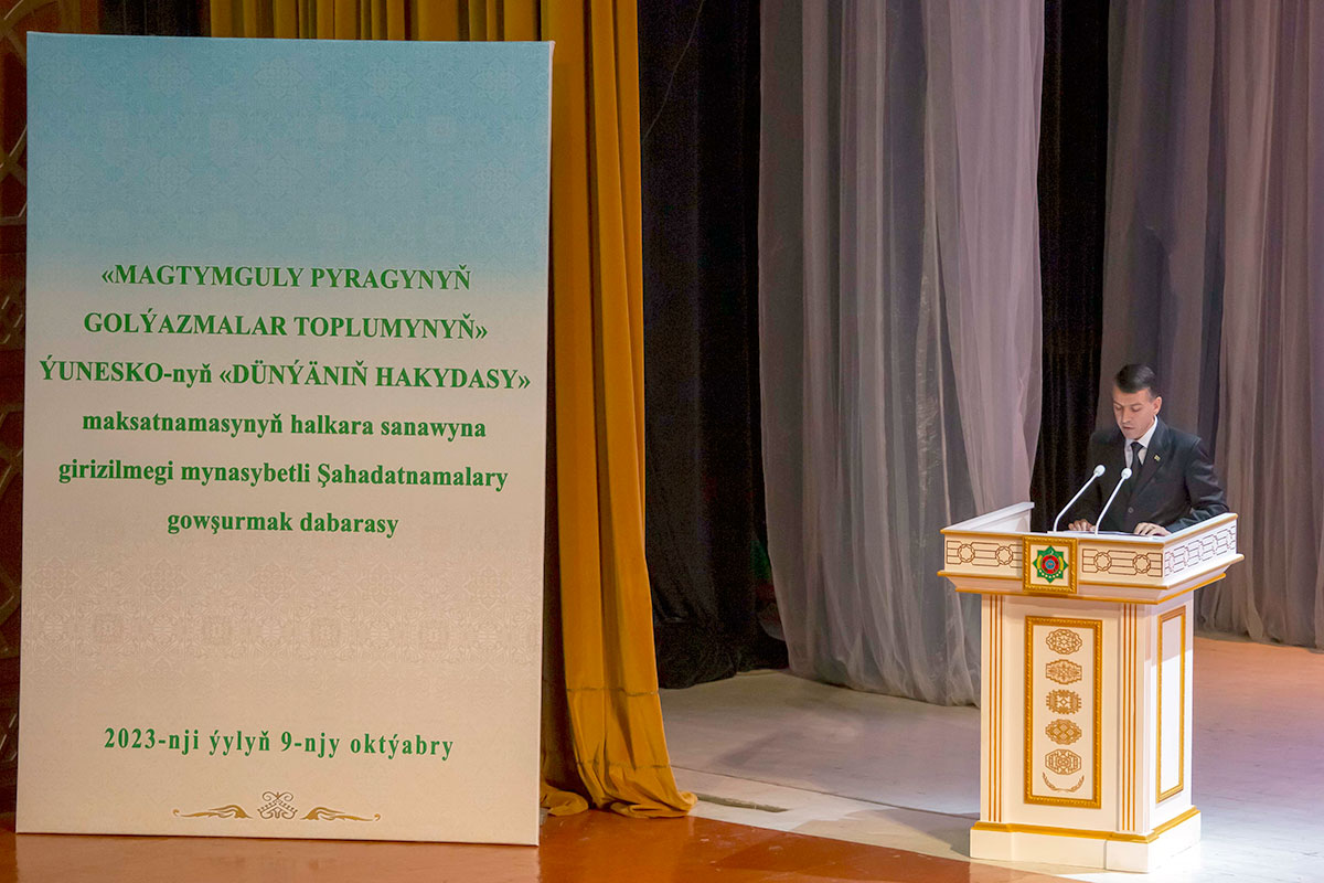 Сегодня во Дворце мукамов Государственного культурного центра Туркменистана состоялось торжественное мероприятие, в ходе которого были вручены соответствующие сертификаты, включения коллекции рукописей Махтумкули Фраги в Международный список «Память мира».
