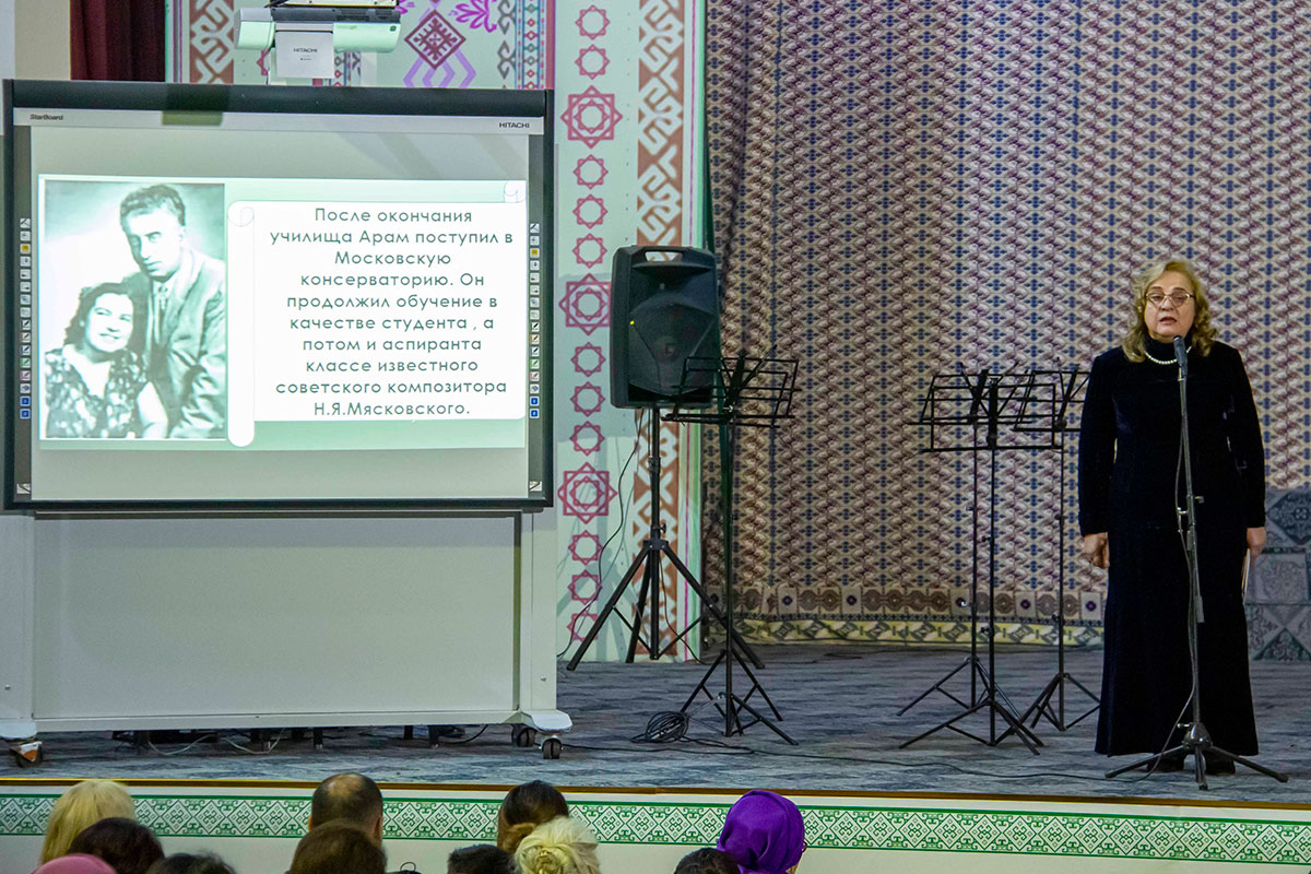 Открыло концертную программу вступительное слово кандидата искусствоведения Елены Осиповой, которая выступила перед собравшимися в зале слушателями с рассказом о жизни и творчестве Арама Хачатуряна.