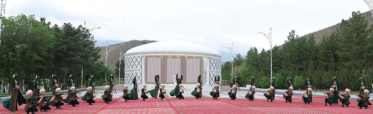 На площади в конце паркового комплекса в исполнении популярных певцов страны звучит песня «Toý mekany».