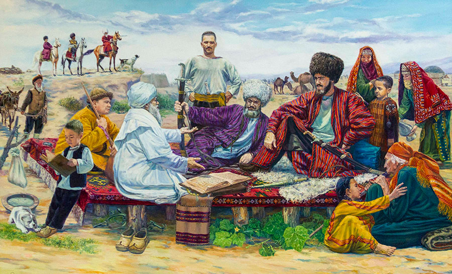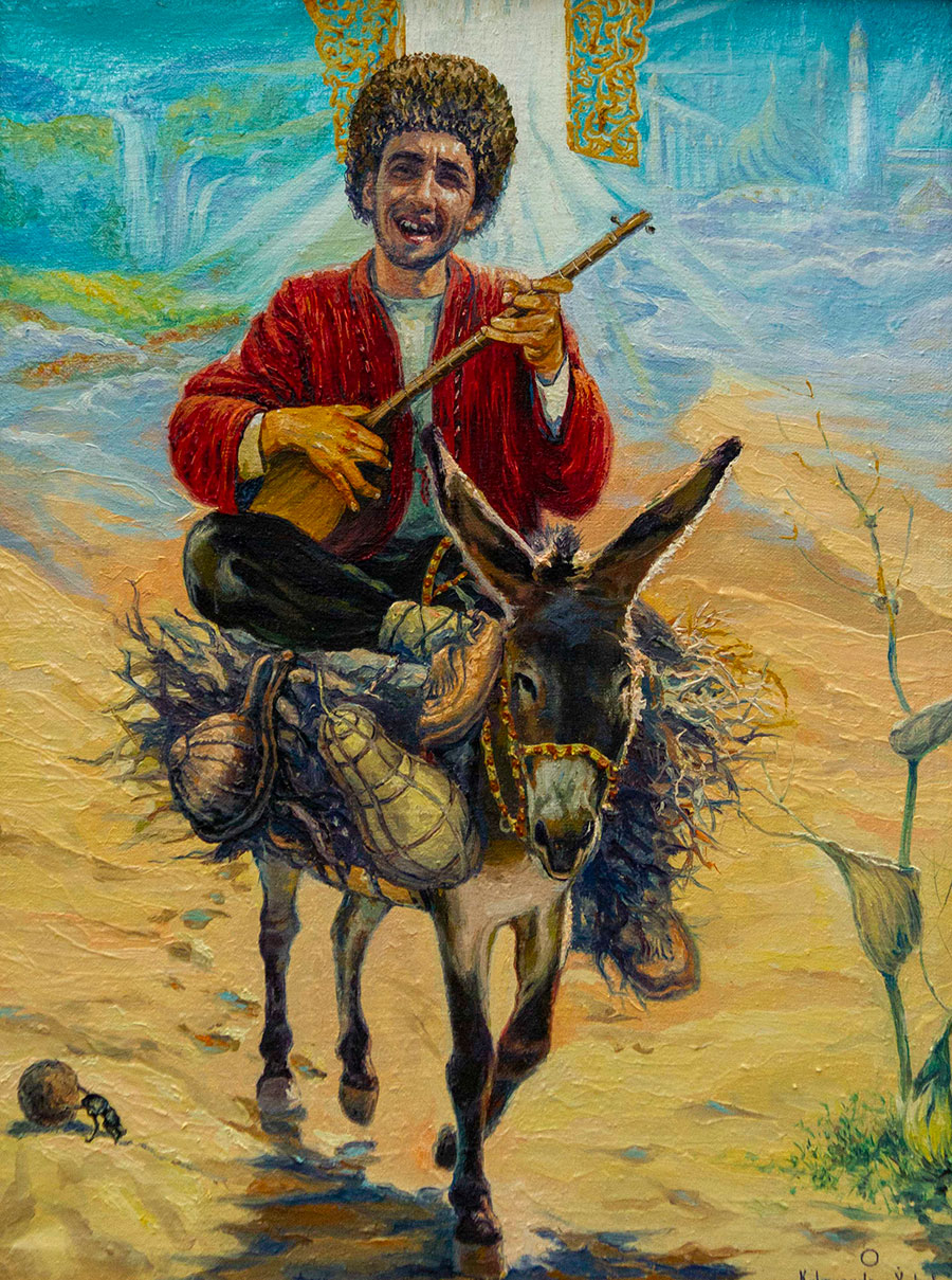 Легенды и сказания – это одна из тем, к которой художник довольно часто обращается в своем творчестве. На выставке представлены работы «Легенда о сизом голубе» из сочинений Махтумкули, «Легенда о медресе Идрис баба», «Сказания чабана» и др.