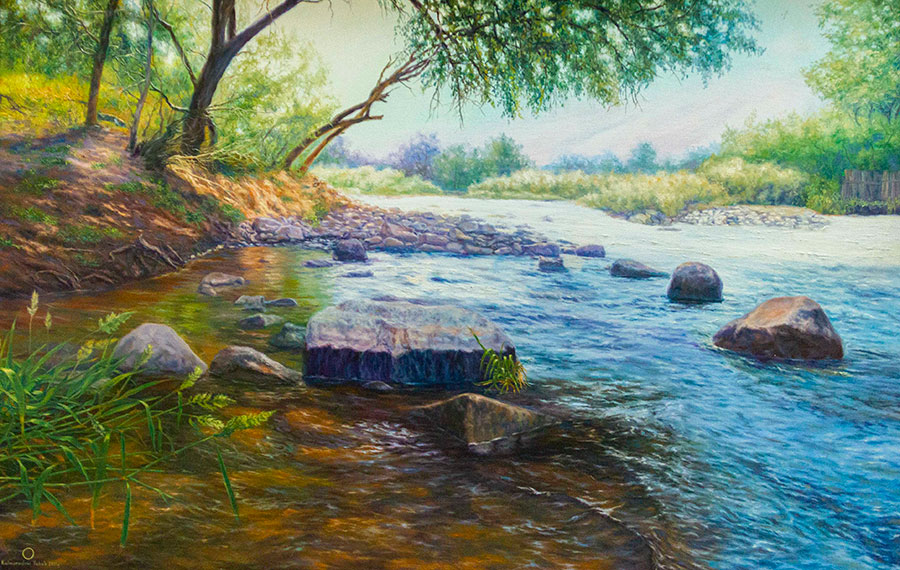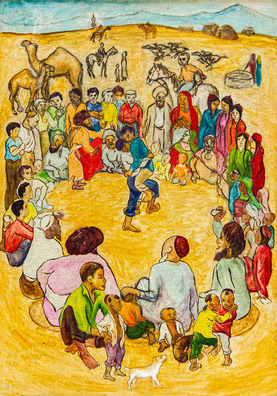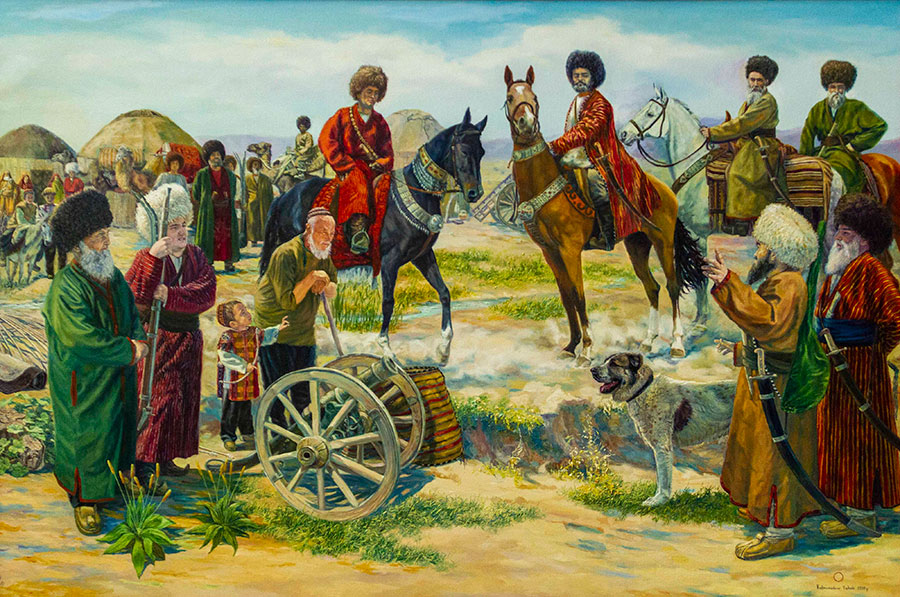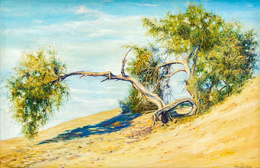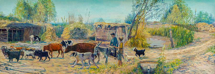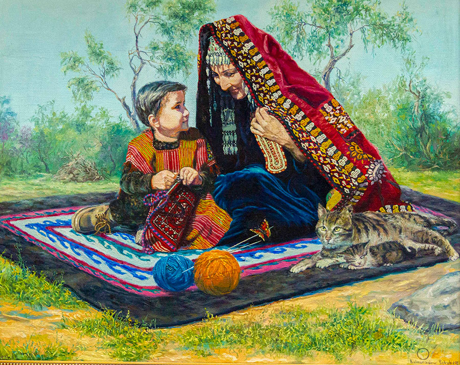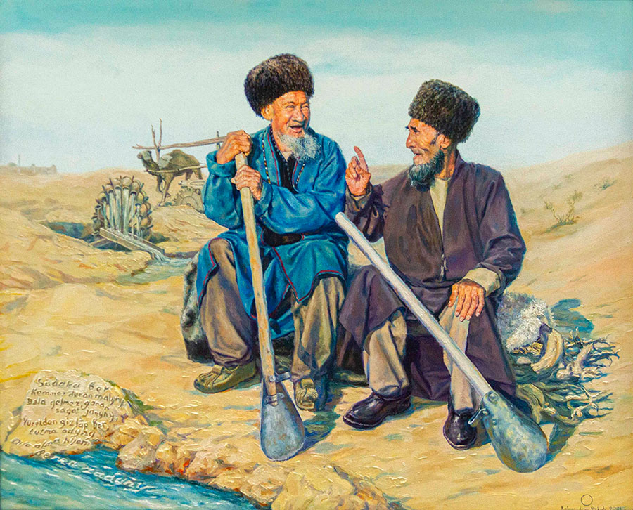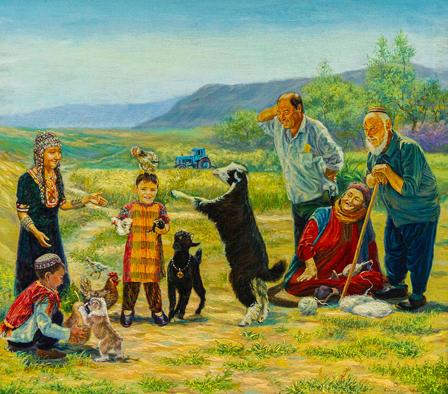 Очень много отличных пейзажей – «Каракала. Мир Махтумкули», «Моллакара», «Девственные уголки Кугитанга». Особенно впечатляет его пейзаж «Зов пустыни». Интересны работы на сельскую тему: «Беседа двух ходжей», «Веселая история», «Детская игра» и другие.