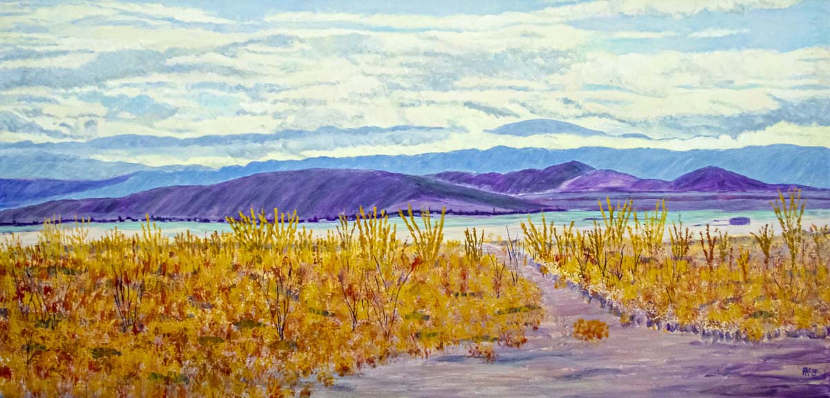 Пейзажи Калугиной настолько своеобразны, что их нельзя спутать с пейзажами других художников. Никто, кроме нее, не видит пустыню в сиренево-лимонных оттенках. А пристрастие к местам паломничества художник объясняет тем, что ощущает здесь царящую ауру благожелательности. Порой фантазия рисует мифические образы, как, к примеру, в картине «Шивлан-баба», где камни, если очень приглядеться, имеют сходство с головами дракона, который издалека охраняет святое место. Увидеть дракона без подсказки практически невозможно. Пейзаж как пейзаж. Но может быть как раз в этом и состоит таинство живописного полотна.