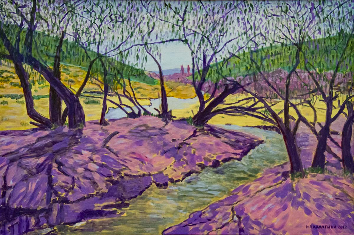 Городской пейзаж занимает в творчестве юбиляра совсем незначительное место. И, тем не менее, каждый из них отличается своеобразием – скученностью домов, напоминающей калейдоскоп из разноцветных крыш домов. Многие картины Калугиной хорошо знакомы зрителям, потому что художник активно участвует в гала-выставках. К тому же восемь полотен Натальи Павловны находятся в Государственном музее изобразительных искусств, причем часть из них занимает место в постоянных экспозициях.