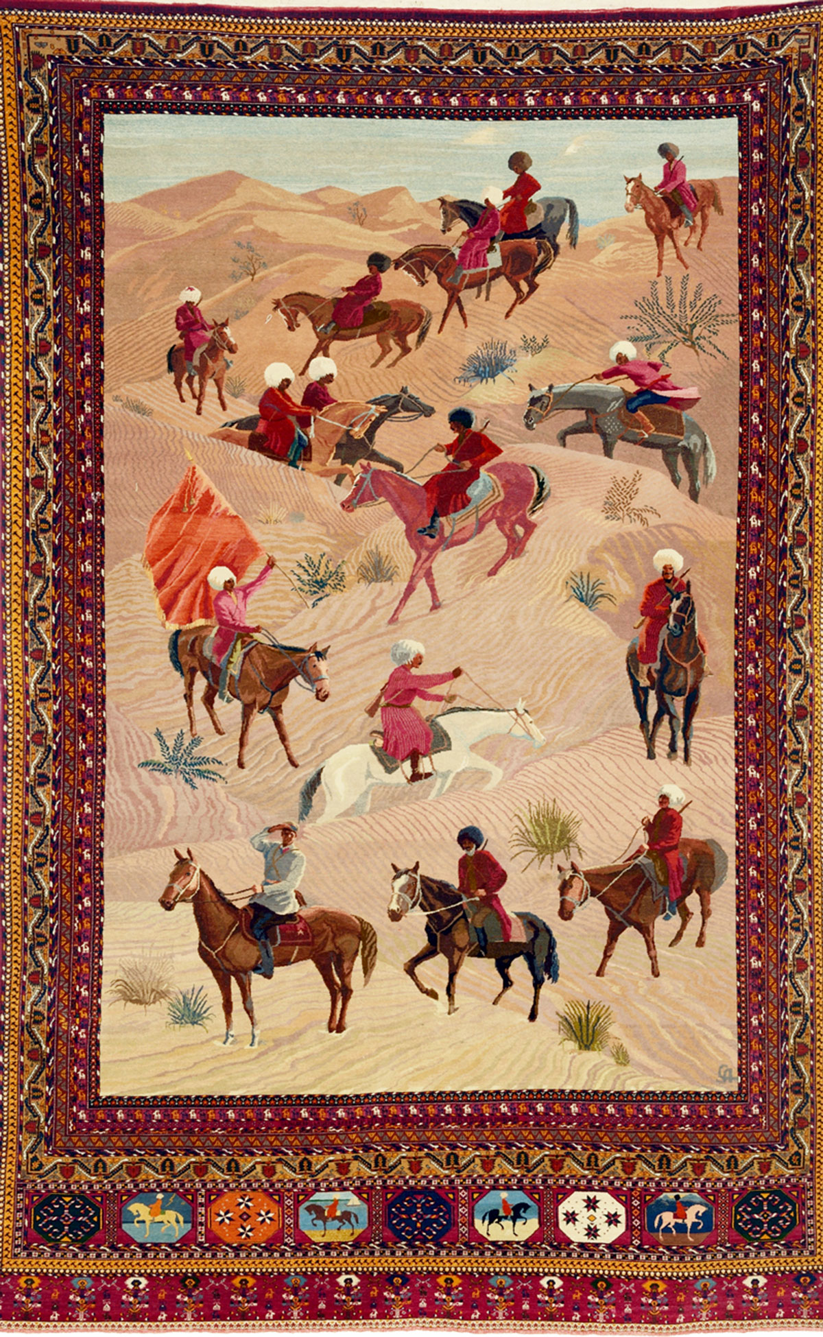Сюжет уникального ковра, сотканного в 1937 году на Ашхабадской ковровой фабрике, посвящён легендарному конному пробегу 1935 года, совершённому на скакунах ахалтекинской породы по маршруту Ашхабад-Москва.