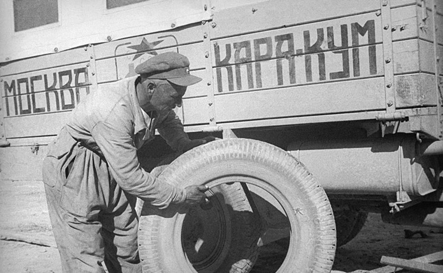 Мелкая пыль проникала во все щели. На солончаковых болотах и выветрившихся гипсовых породах скорость падала до 1км/ч. Проблемой было снабжение людей и машин водой. Двигатели работали с перегрузкой, требовали усиленного охлаждения, нередко на это расходовались запасы питьевой воды… Путешествие шло от колодца к колодцу, кругом – никаких ориентиров. Но старый туркмен-проводник, сопровождавший караван, быстро определял дорогу и по какому-то одному ему известному признаку выводил колонну на караванные тропы. Однажды положение стало угрожающим. Путь к колодцу, где нас ожидал караван верблюдов с водой, преградил крутой затяжной подъем. На помощь двигателям пришли люди. Они тащили автомобили канатами, подпирали кузова сзади. Штурм длился двое суток, были израсходованы все запасы воды, обожжённые солнцем люди, выбивались из сил, но упрямо шли к цели.» Всё это фиксировал на камеру во время пробега кинодокументалист Роман Кармен.