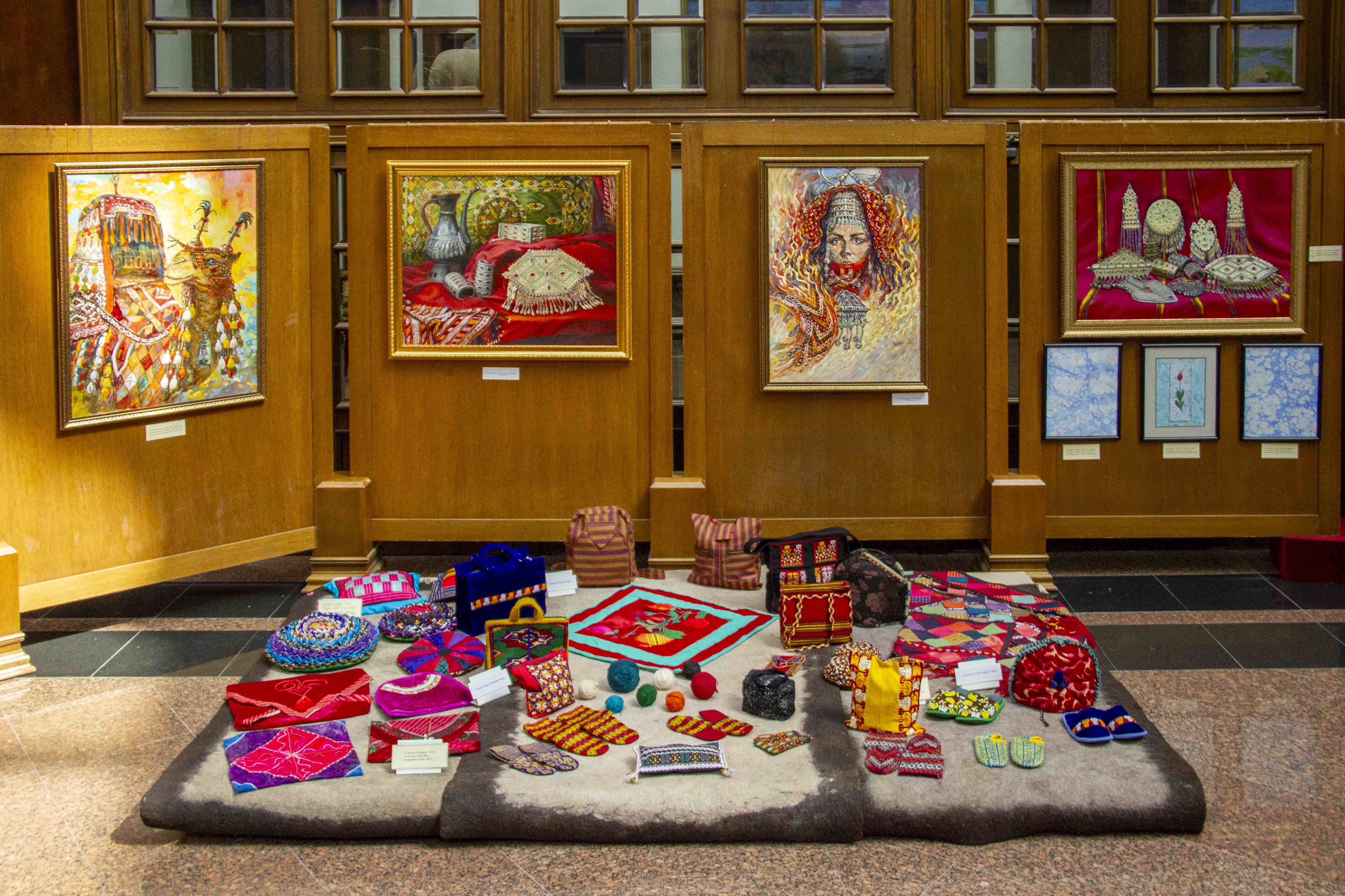 Особое место на выставке уделено туркменской вышивке. Среди изделий - тюбетейки, платки, курте (свадебная накидка), попоны для верблюдов, вышитые сумки и покрывала. Отличились в искусстве вышивания - Нурсолтан Аширова и Огулширин Джепбарова.