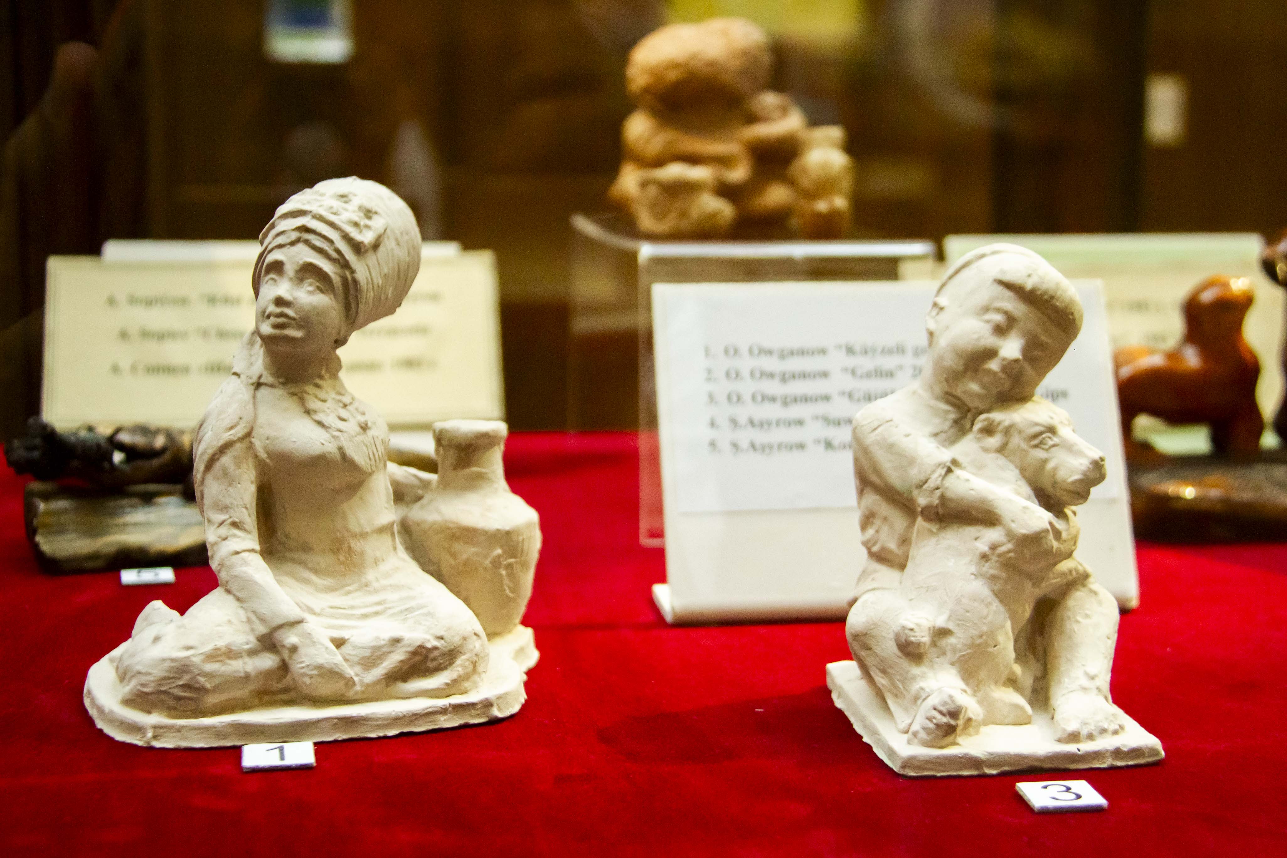 В витринах выставки можно увидеть миниатюрные статуэтки, выполненные из различных материалов в современном и национальном стиле, которые прекрасно сочетаются друг с другом и придают оригинальность экспозиции. Это работы Алланазара Сопыева и Шагельды Аширова.