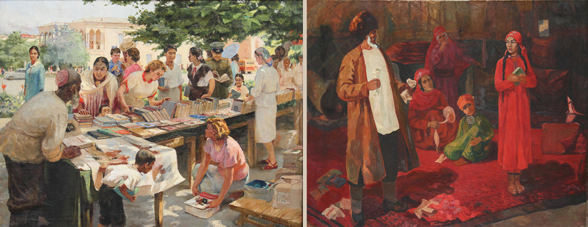 Наполненная ярким солнечным светом картина «Книжный базар» Иззата Клычева – это шедевр, который особенно понятен и дорог жителям столицы. Наконец-то, Ашхабад восстановился от последствий землетрясения. Люди потянулись к знаниям, которые на тот момент находились только в книгах. Народному художнику удалось очень точно передать дух того времени: архитектура центра столицы, поведение людей и одежда, соответствующая моде того периода.