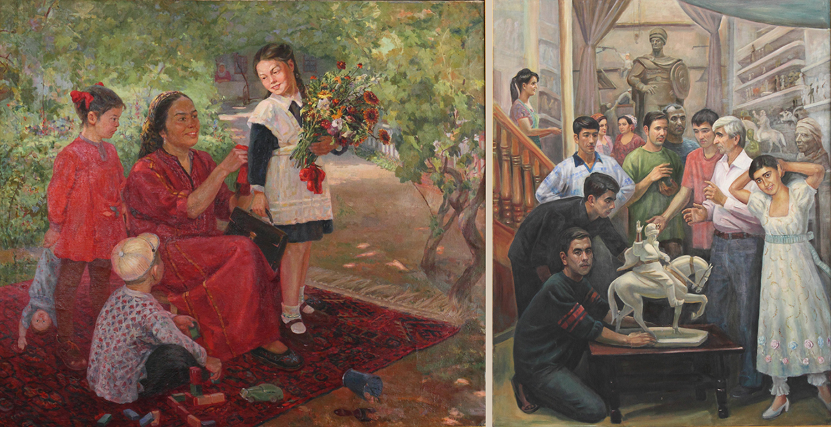 В хранилищах музея имеются картины на тему Дня знаний, без которых немыслимо раскрытие этой темы живописными полотнами. Из года в год они оставляют свои постоянные места жительства и переходят в экспозиционный зал, чтобы вновь встретиться со зрителями. Это, конечно же, работы «1 сентября» Евгении Адамовой и «Книжный базар» Иззата Клычева. В картине «1 сентября» передан психологический рассказ о тех эмоциях, которые переживают все члены семьи, собирая первоклассницу в школу: восхищение младшего брата, ревность сестренки, гордость мамы и любопытство соседки. Сама же первоклассница пребывает чуть-чуть в высокомерном настроении –теперь она ученица.