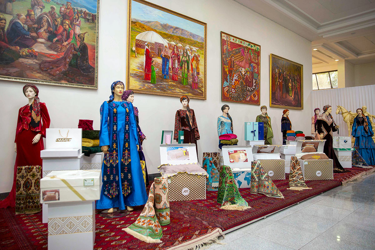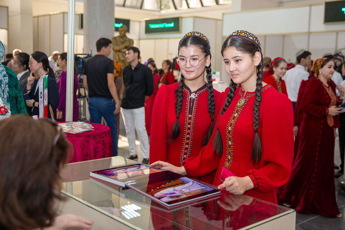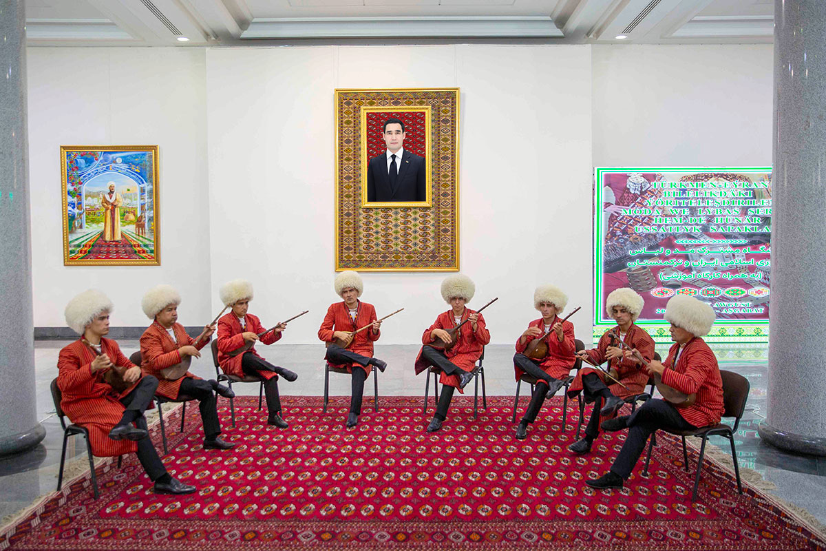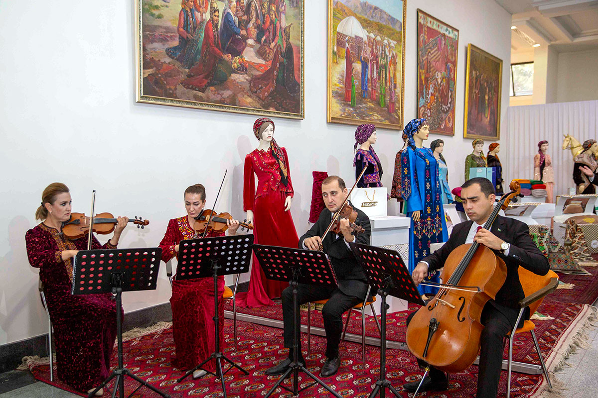 Для посетителей выставки, внимательно рассматривающих выставленные текстильные и кожаные экспонаты, звучали туркменские народные мелодии в исполнении ансамбля дутаристов и струнного квартета.