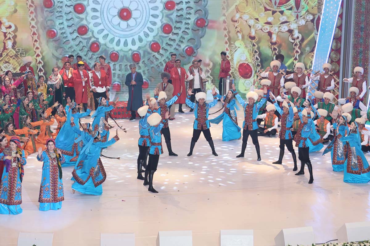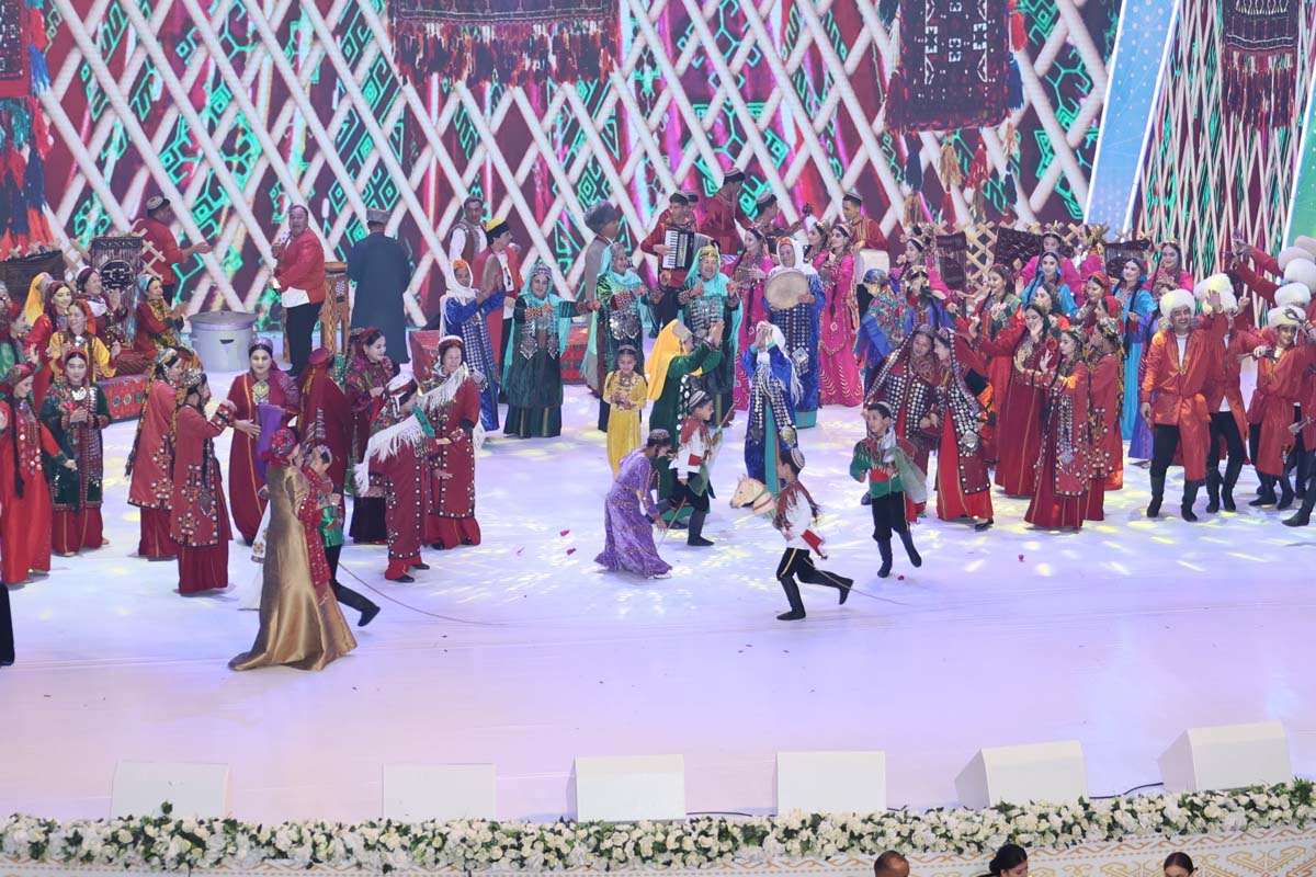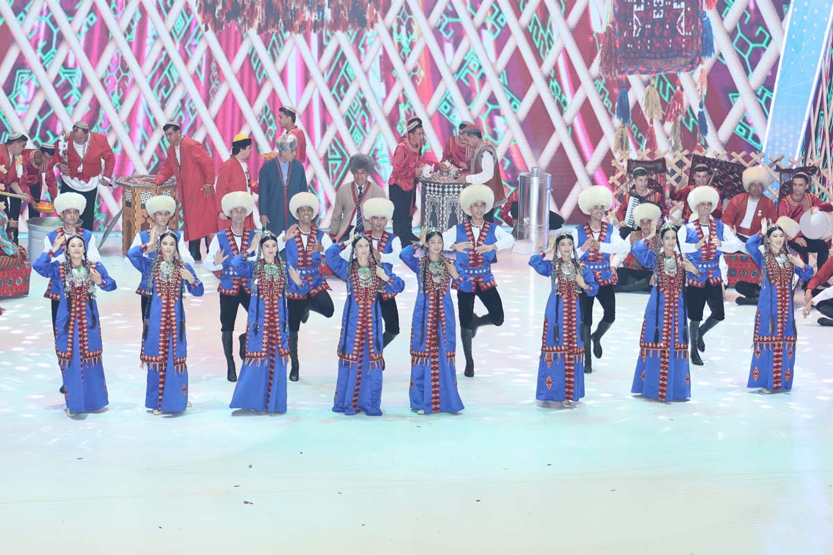Со сцены звучали лучшие образцы национальной песенно-музыкальной классики и современные произведения, исполнялись оригинальные вокально-хореографические композиции, прославляющие Родину, её красоту и могущество. Органично вписались в праздничную программу фольклорные номера, воссоздающие пронесённые через века самобытные обычаи и традиции туркменского народа.