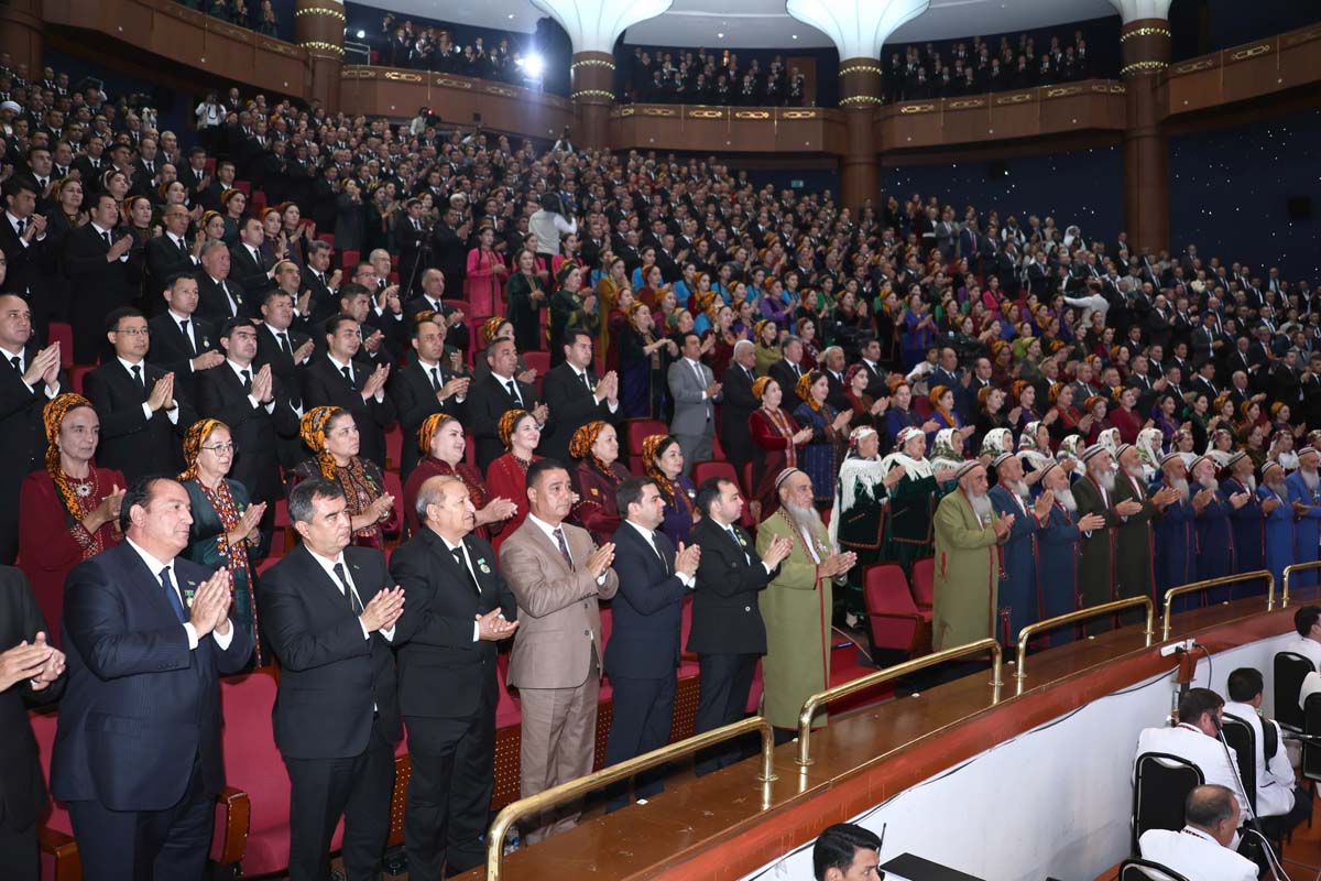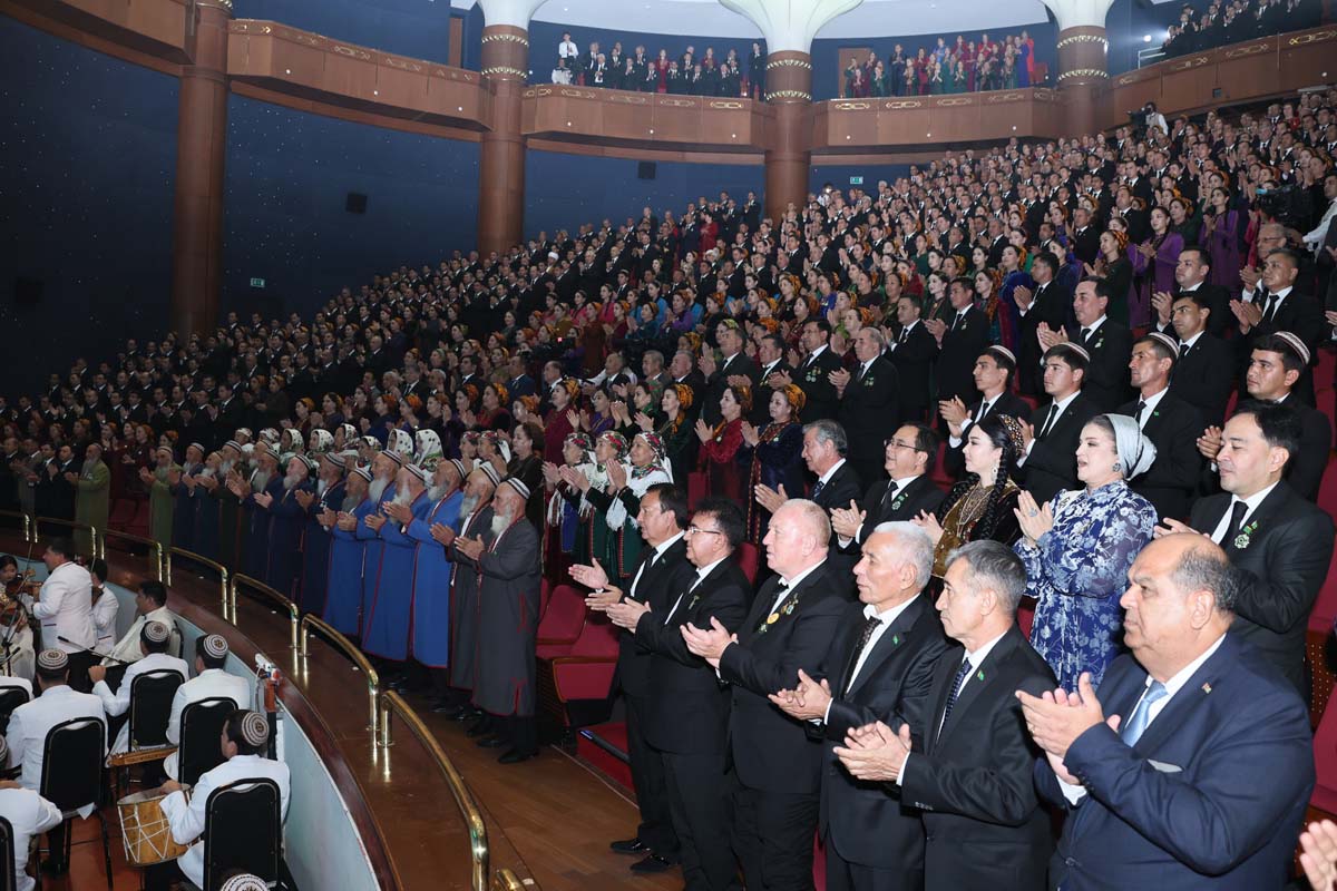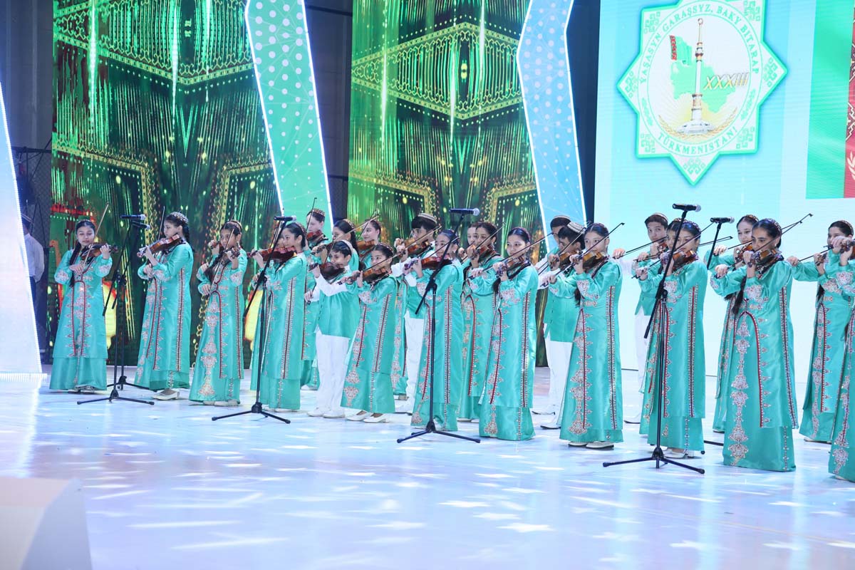 Зал рукоплескал замечательному выступлению детского танцевального ансамбля «Şowhun», Государственного танцевального ансамбля Туркменистана и группы барабанщиков «Arçabil», виртуозно исполнивших праздничную литературно-музыкальную композицию «Oguzlar». Номер, наполненный национальным колоритом, искренностью детского творчества, стал олицетворением счастья и благополучия суверенной Отчизны.