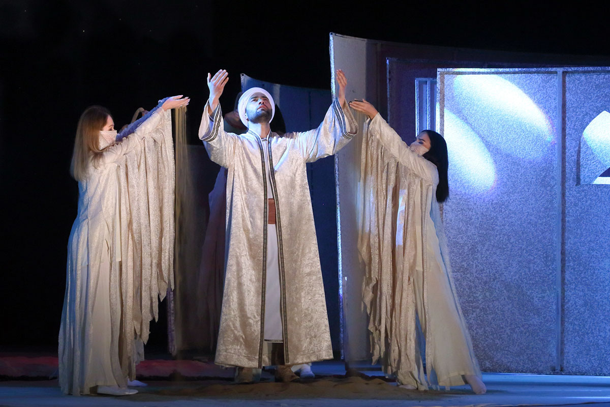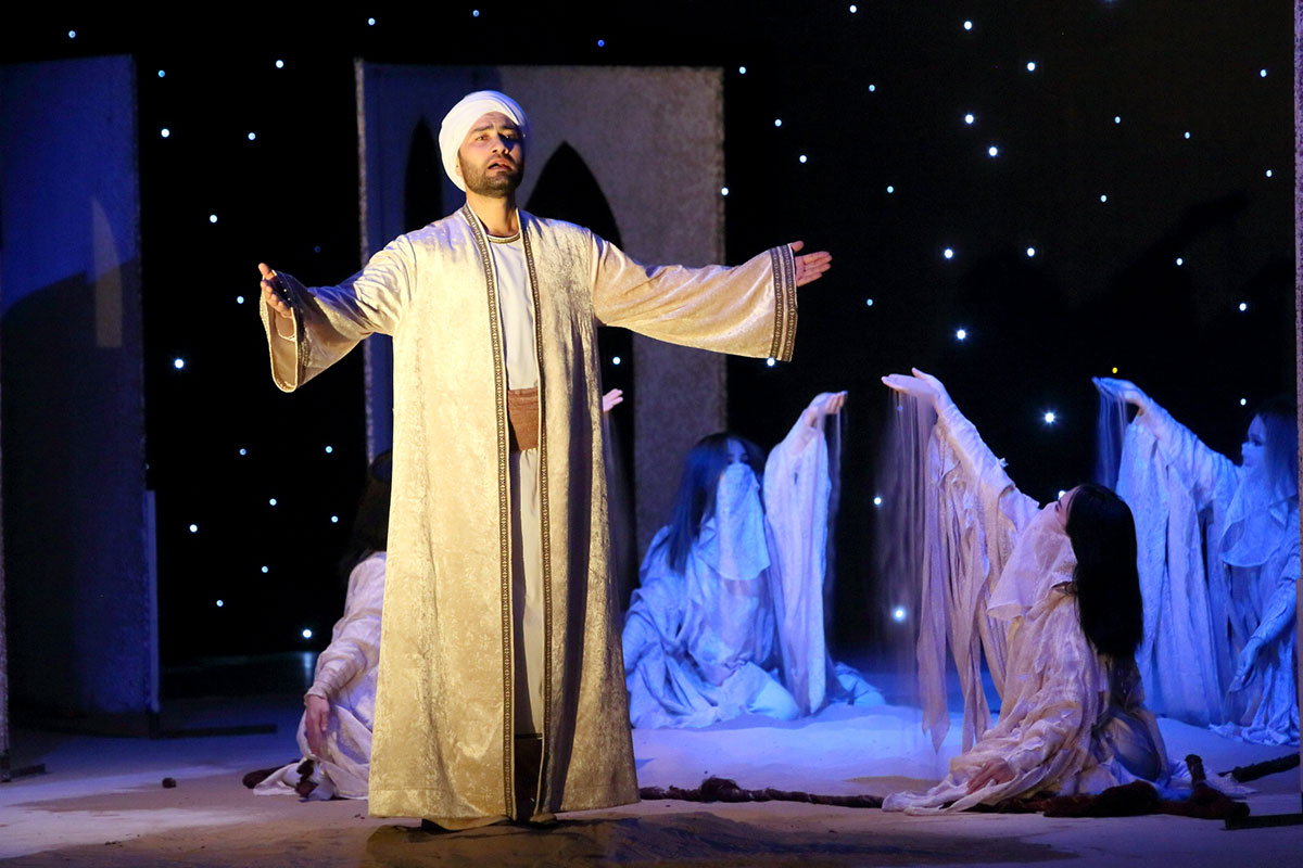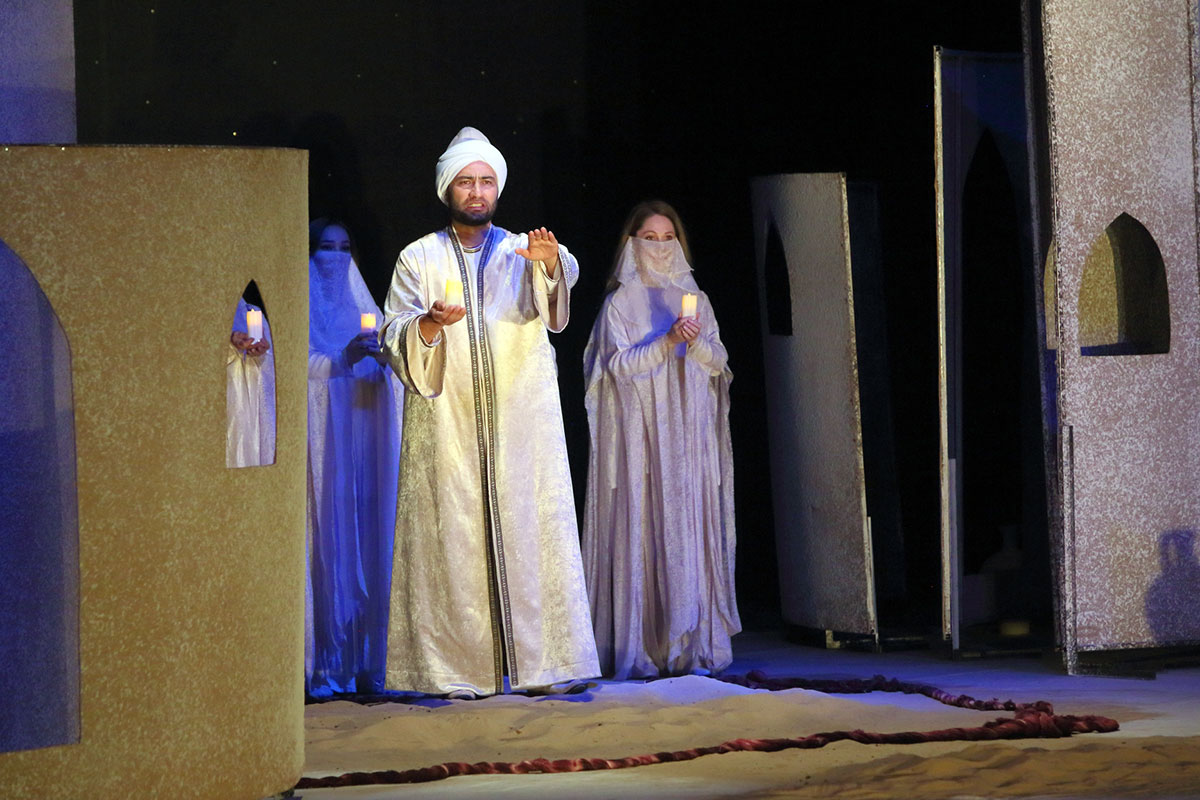 Сценографическое решение восхитило всех зрителей: на сцене возник город из Восточной сказки. Звездное небо, узкие улицы, дома, в которых происходят различные житейские ситуации и присутствие девушки с печальным лицом. Это – образ Менгли, который жил в душе поэта на протяжении всех лет учебы.