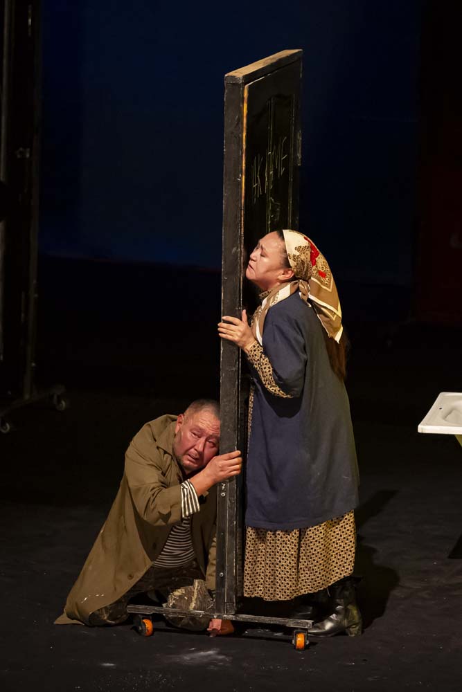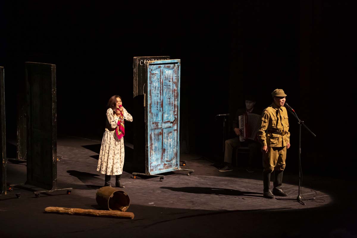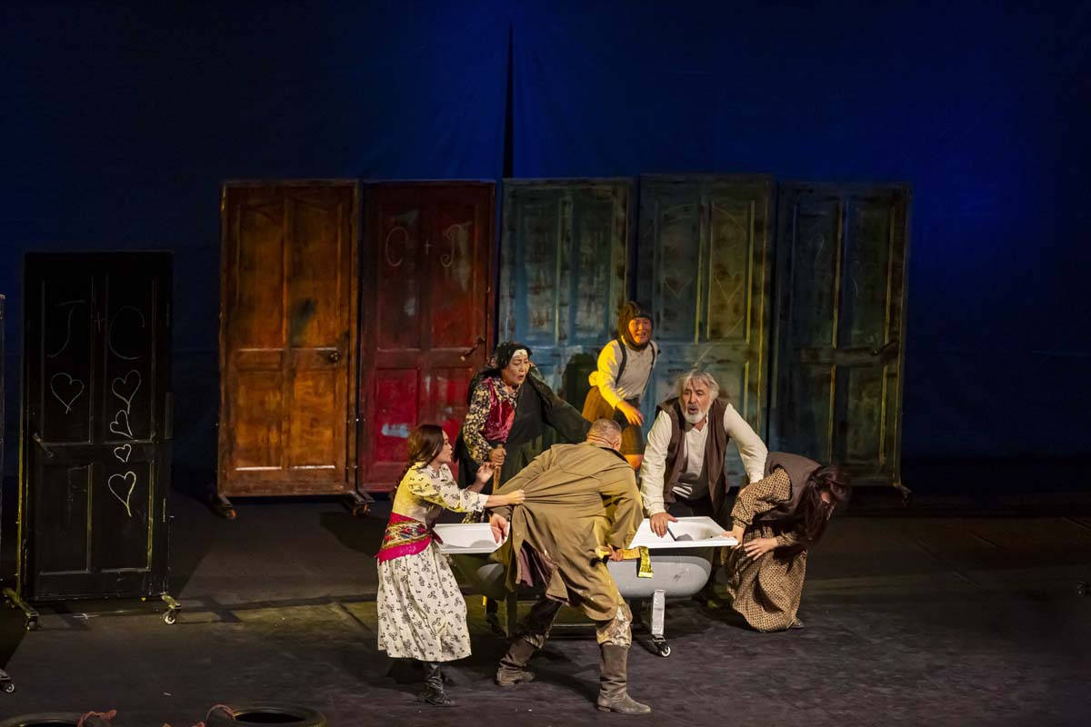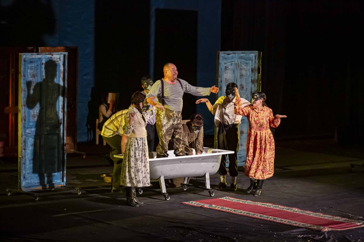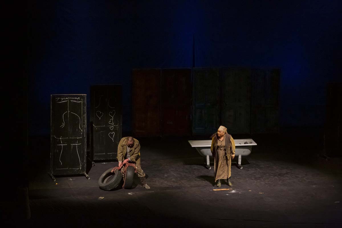 На сцене стояла обычная ванна в окружении множества пошарпанных дверей – такое неожиданное решение сценографии подчеркивало отсутствие уюта в жизни людей на кордоне и одновременно служило аллегорией несбыточной мечты мальчика о белом пароходе, который однажды остановится в этих местах, и оттуда выйдет на берег его папа.