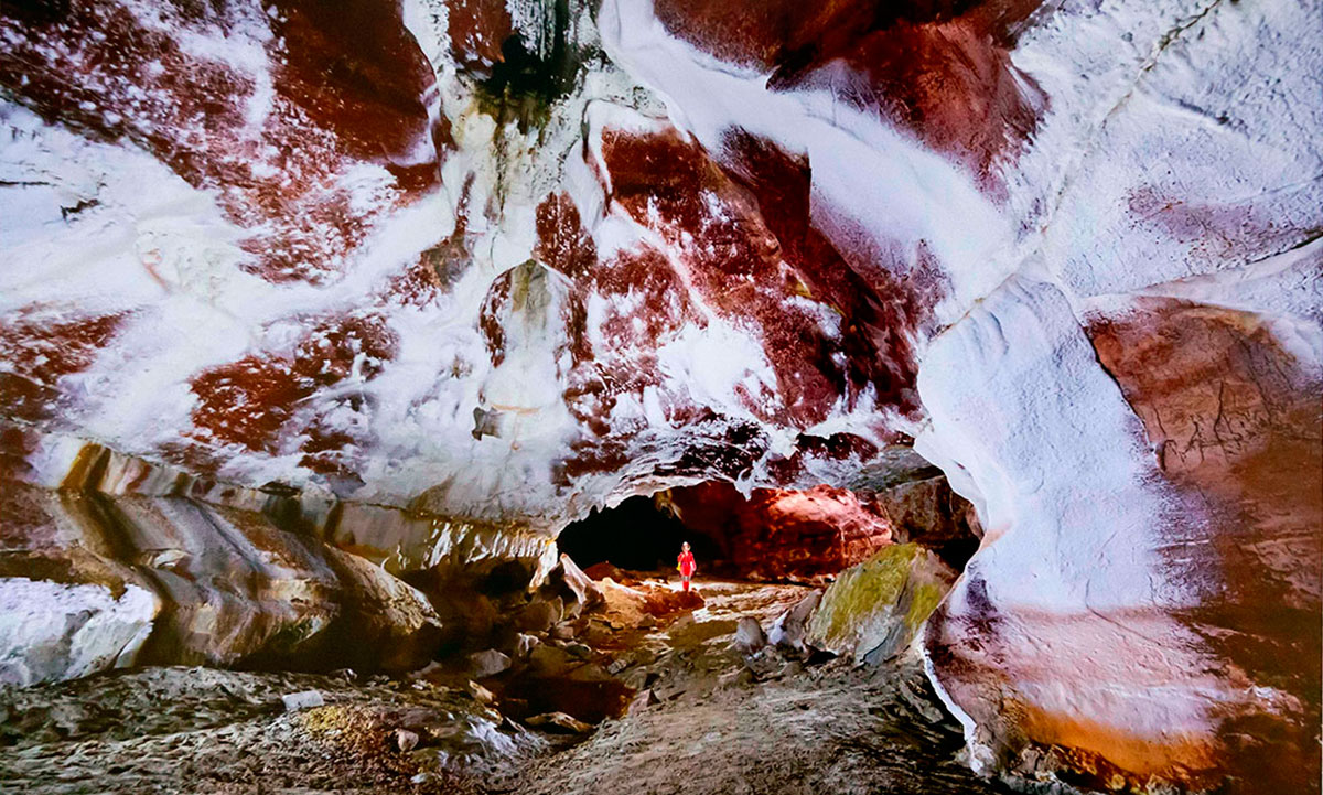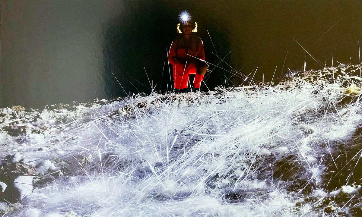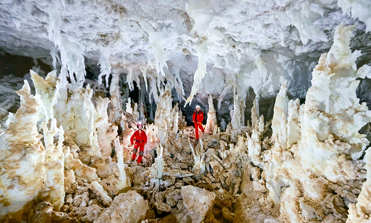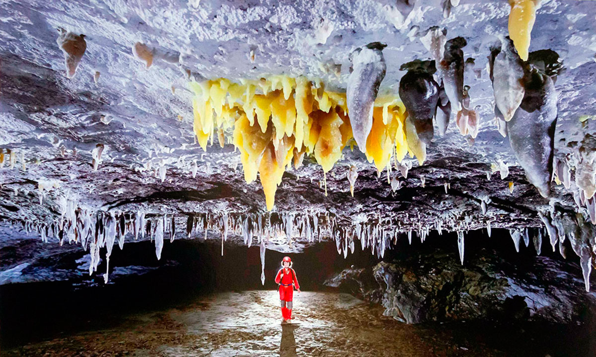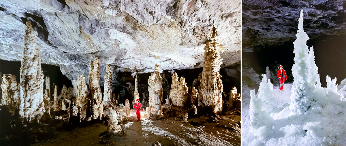 Фотосъемку пещерных особенностей проводили Филипп Кроше и Анни Гир. Филипп и Анни уже много лет работает в пещерах по всему миру. Но в Койтендагском массиве на границе с Узбекистаном они встретили редкую красоту, о которой только может мечтать спелеонтолог. Геофизическая пещера встретила их в исключительном подземном убранстве: огромные подсвечники, тончайшие иглы, изящные цветы, ажурные веточки, а также гигантские полые сталагмиты, обширные галереи с красными потолками, огромные красочные драпировки. Это настоящий праздник для глаз! В экспозицию вошло несколько фотографий пещеры Хашим-Ойук, интересной своими массивными гипсовыми конкрециами.
