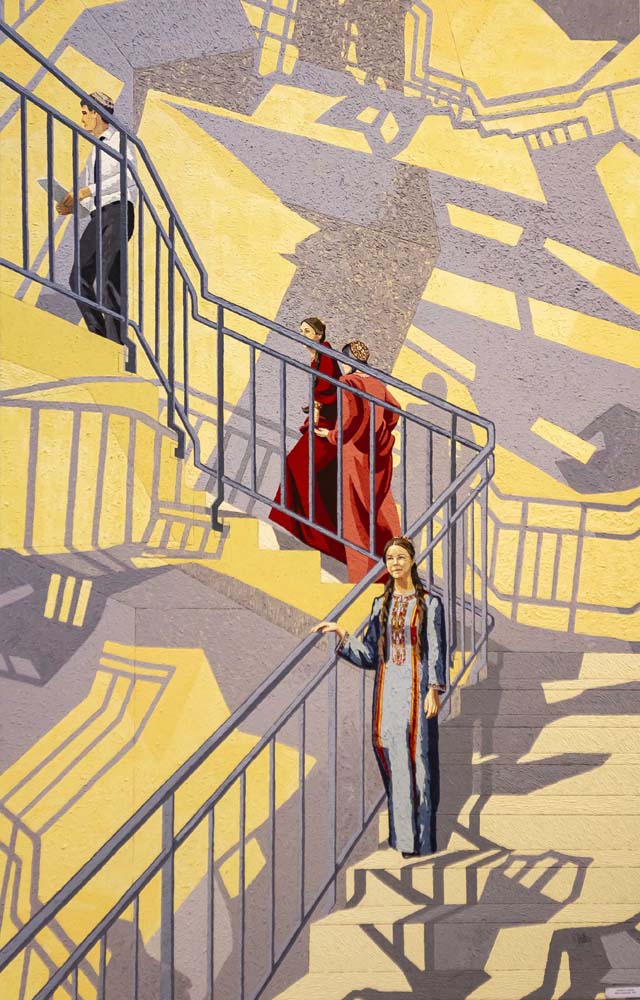 Еще одна картина, которая получила всеобщее одобрение, - работа Айзады Пирлековой «8.30». Название картины - это время начала занятий в Академии. Студенты поднимаются по лестнице в аудиторию. Лестница изображена Айзадой в вертикальном ракурсе. Тени от парапетов «разбросаны» по всему полотну. Серо-желтая палитра придает живописной картине схожесть с плакатным жанром. Характерная деталь: лестница – это не вымышленная автором место, она на самом деле существует в Академии.