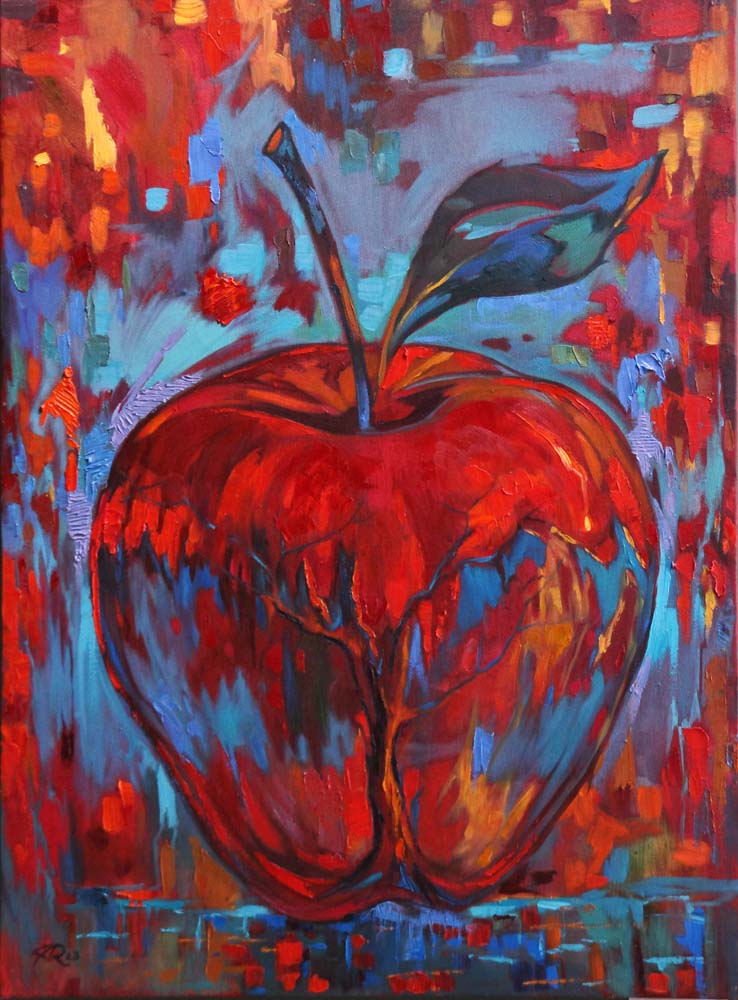 В другом произведении «Первое яблоко» Рустам представил разделенное пополам яблоко, обнажив в его сердцевине семена. Автор добавил в яблоко зачаток нового дерева, мысленно перенеся зрителя во времена Адама и Евы. Первое яблоко, это – то самое яблоко, с которого, согласно библейской притче, началось продолжение жизни на земле. Автор использовал символизм в передаче своих мыслей.