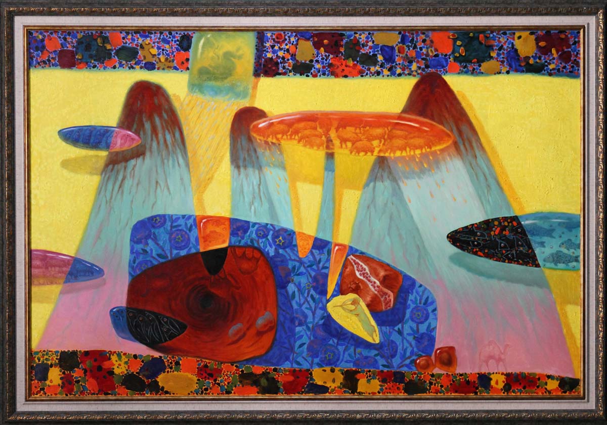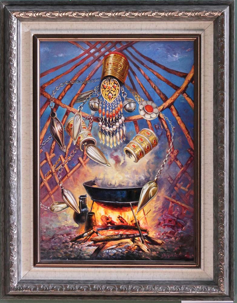 Художник Гахрыман Гочмурадов – известный любителям живописи как автор картин «В гостях у однокурсника» и «Танец», написанных в виде мозаики из разноцветных пятен, на эту выставку представил иллюстрацию к эпосу «Героглы», созданную в сюрреалистическом направлении.