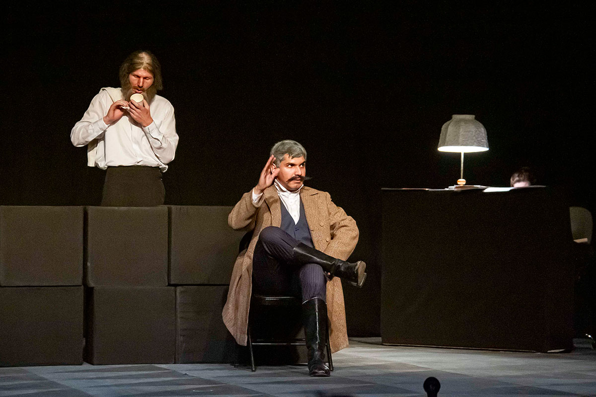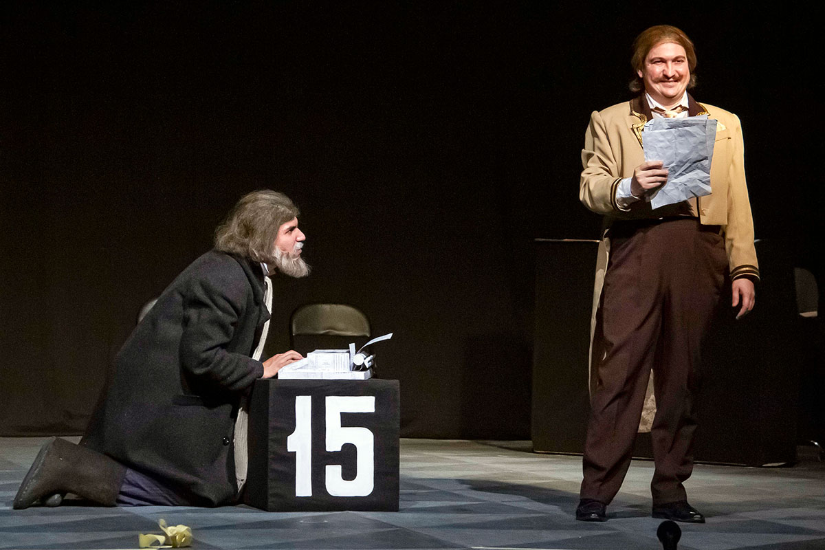 И неожиданно для зрителя спектакль начался с конфликта между писателем и издателями книг и журналов. «Такого не бывает» был вынесен вердикт его произведениям. Писателя, удрученного непониманием критиков, утешает супруга Ольга Леонардовна (актриса Алина Андронова). Желая отвлечь мужа, она садится за пианино в углу комнаты и превращается в концертмейстера, сопровождающего музыкой весь спектакль.