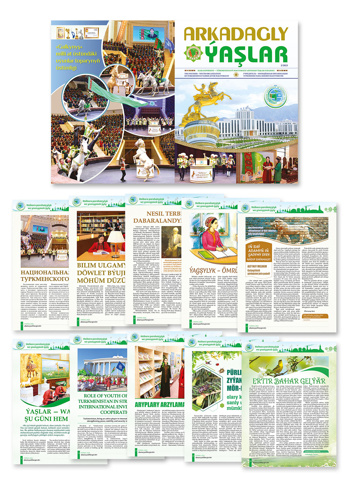 Свежий номер журнала открывается стихотворением, проникнутым гордостью за наше прекрасное время, а в статье на русском языке «Национальная гордость туркменского народа» рассказывается об успехе Группы национальных конных игр «Galkynyş» на международном фестивале циркового искусства в Монте-Карло.