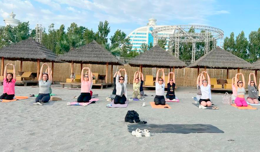 По случаю Международного дня йоги, ежегодно отмечаемого 21 июня, в Национальной туристической зоне Аваза энтузиасты йоги провели практическое занятие прямо на побережье Каспийского моря.