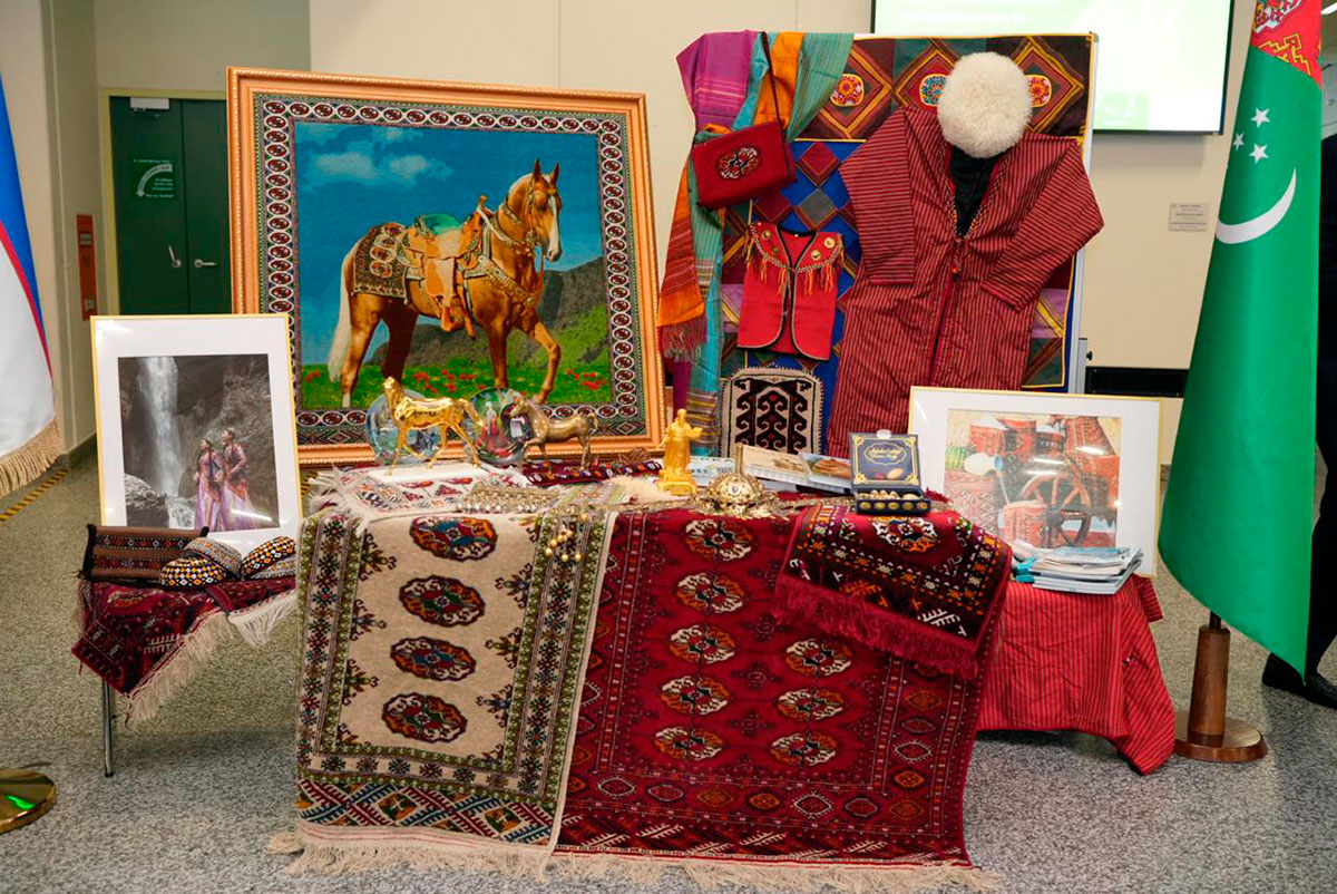На выставке были представлены традиционные туркменские ткани, национальные костюмы, ковры, изделия народных мастеров, серебряные украшения, а также художественные изображения ахалтекинского коня. Эти экспонаты подчеркнули богатство туркменского прикладного искусства и глубокое культурное значение коня, отражая дух обозначения 2026 года.