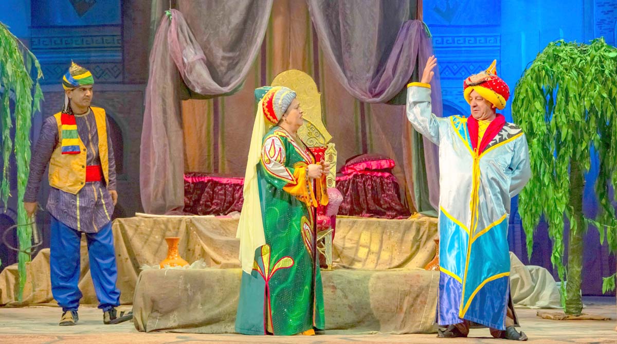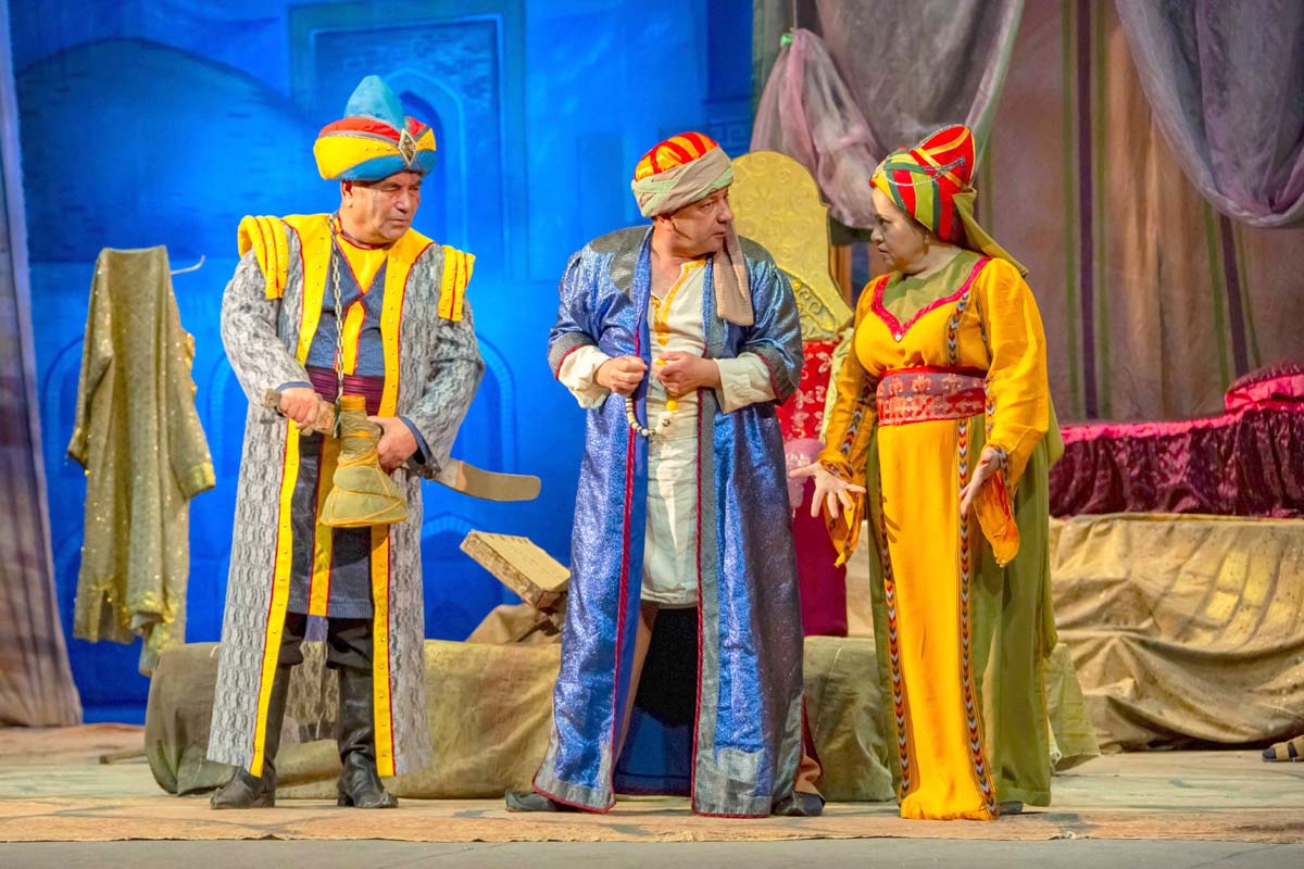 Сюжет комедии, созданной Джорой Худайбердиевым по мотивам сказок «Тысячи и одной ночи», строится вокруг истории властной женщины и её нерадивого супруга.