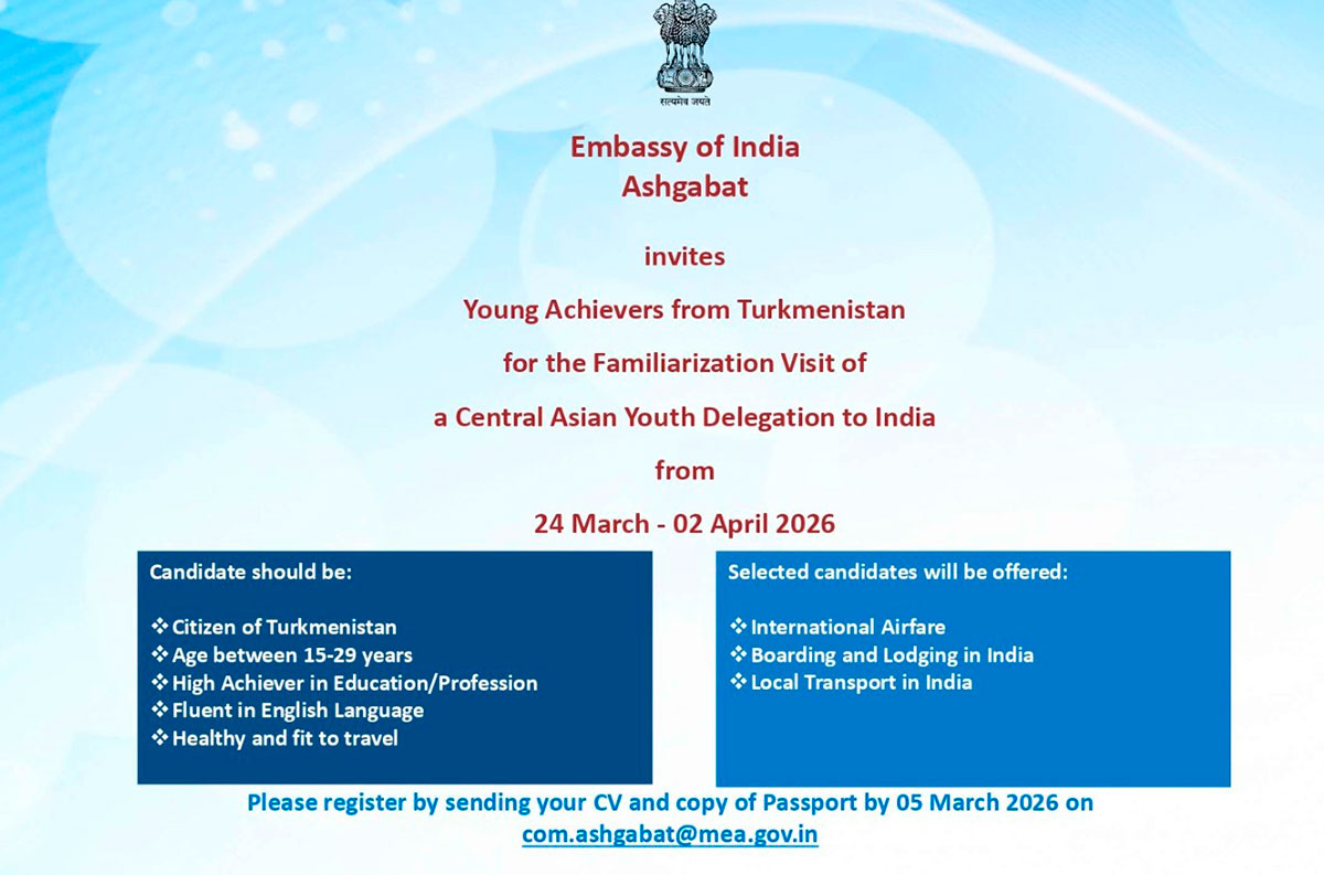С 24 марта по 2 апреля 2026 года, Посольство Индии в Ашхабаде, организует ознакомительный визит молодёжной делегации из Центральной Азии в Индию.