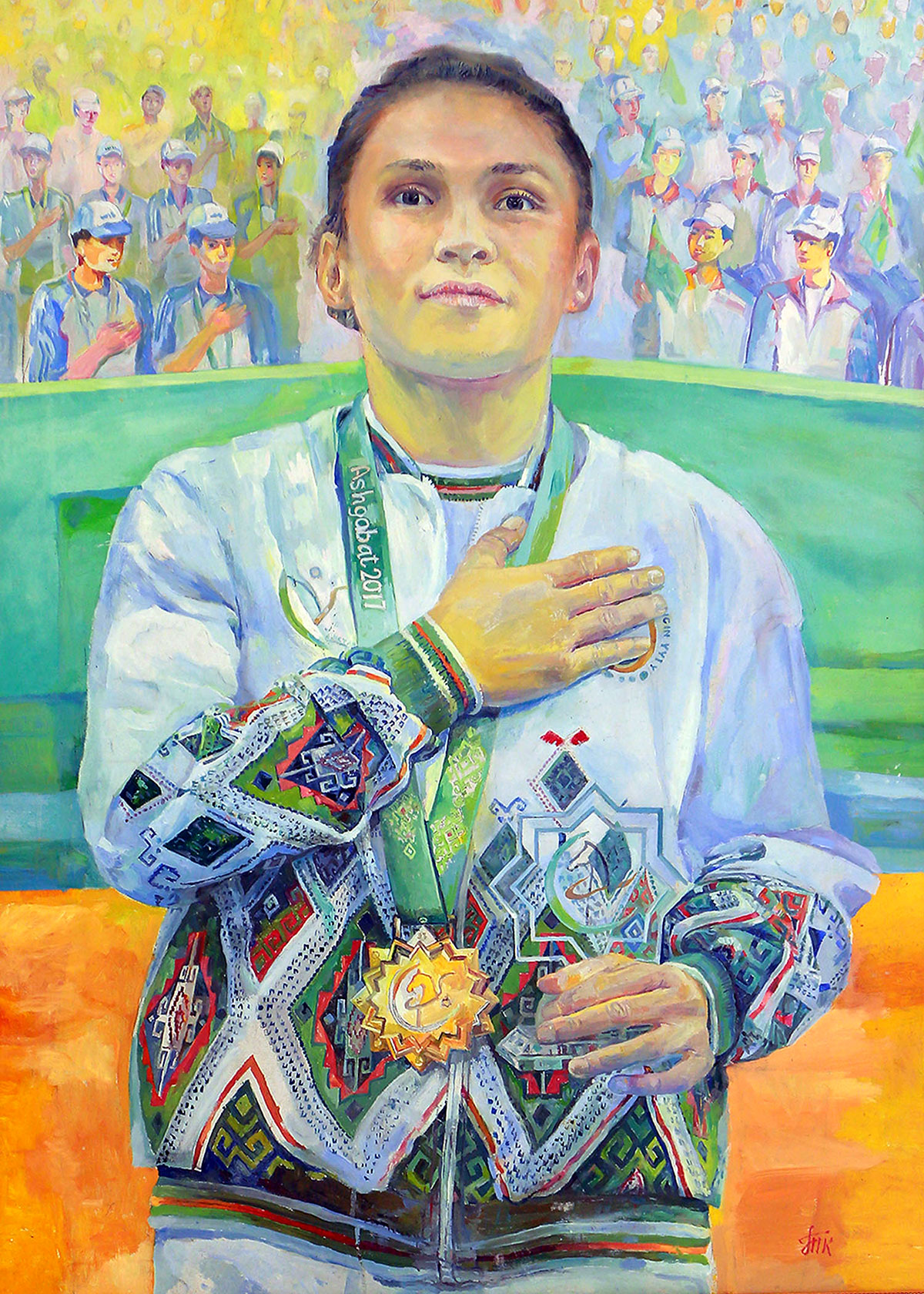 Тамара Киселева, которая в этом году отмечает свое 90-летие, - автор портретов двух знаменитых спортсменов – Дженнет Гельдыбаевой, многократного чемпиона по самбо, серебряного призера по юношеским играм в Сингапуре и Гульбадам Бабамурадовой, чемпиона по борьбе. Оба портрета выполнены художником в одной технике, что объединяет их и не только по спортивной теме, но и по авторскому исполнению. Кстати, эти картины часто выставляются на различных выставках.
