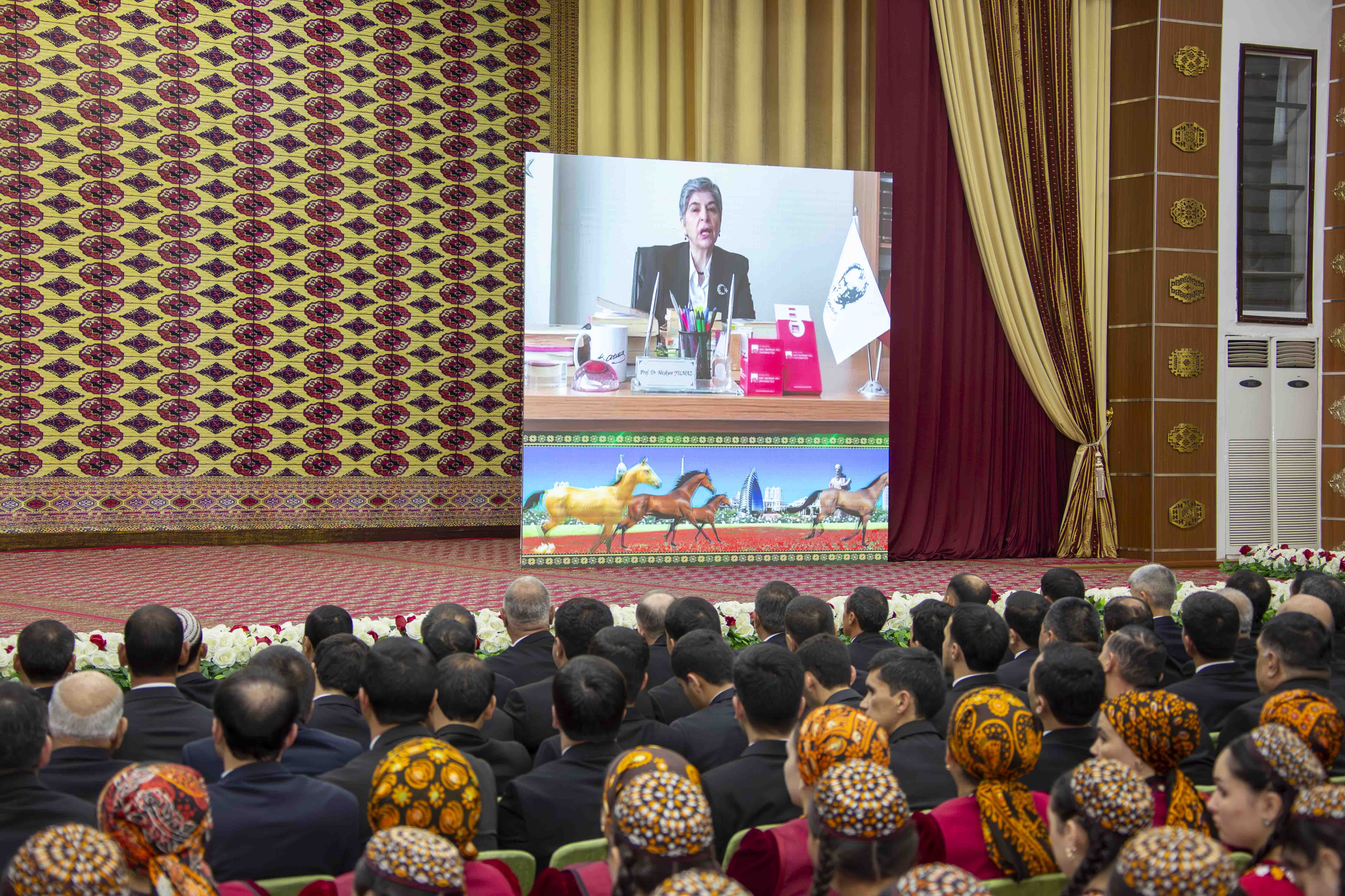 Затем в конференц-зале вуза состоялось пленарное заседание международной научной конференции. Поздравив собравшихся с Нацио­нальным праздником туркменского скакуна, выступавшие подчеркнули особую значимость мероприятий, проводимых по этому случаю в году «Независимый нейтральный Туркменистан – родина целеустремлённых крылатых скакунов», ознаменованном 35-летием суверенитета страны. Выведенные нашими предками на древней туркменской земле быстрые, как ветер, ахалтекинцы стали общечеловеческой ценностью, по праву считаясь одной из самых известных среди всех существующих на планете пород лошадей. Ярким подтверждением тому служит включение искусства ахалтекинского коневодства и традиций украшения коней в Репрезентативный список нематериального культурного наследия человечества ЮНЕСКО. Наши «небесные» кони, являющиеся национальной гордостью благодаря своей преданности, красоте, стремительности и выносливости, в современную эпоху остаются «крыльями» и истинным достоянием страны.