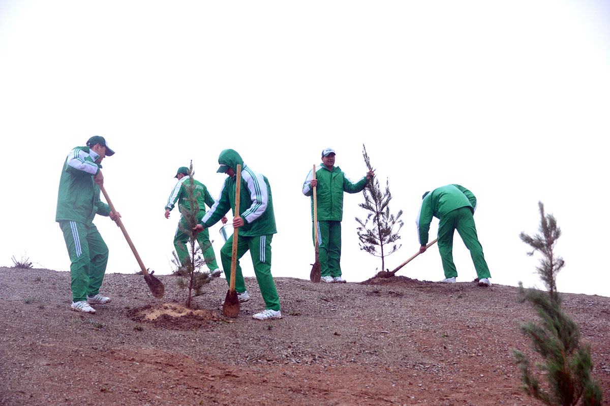 На многих тысячах гектаров в разных уголках Отчизны, особенно в живописных предгорьях в окрестностях туркменской столицы, сегодня раскинулись зелёные оазисы. На когда-то голых холмах и склонах шумят хвоей сосновые боры, счёт деревьев в них уже идёт на десятки миллионов. На пустынных территориях высаживаются саксаул, кандым, черкез, присущие Каракумам. Ежегодные массовые озеленительные кампании увеличивают площади этих лесов, которые стали живым символом подвижнического труда туркменистанцев.