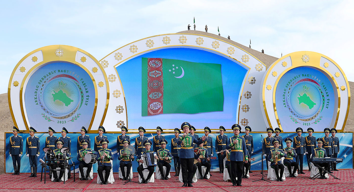 Приняв рапорт, Президент Туркменистана приветствует собравшихся и наблюдает за выступлениями песенно-музыкального коллектива военнослужащих МВД, исполнившего зажигательные танцы, символически объединившие тему истории и современности, образно передавшие динамику нынешней жизни Отчизны, сравнимую со стремительностью «небесных» скакунов.